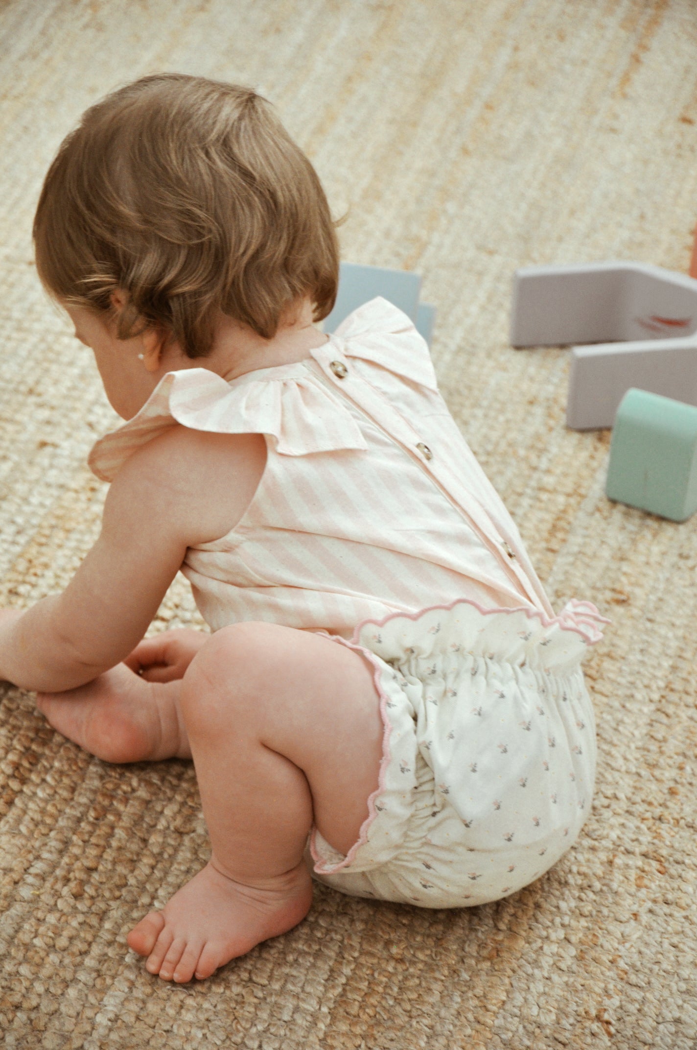 Culetín en estampado exclusivo de delicadas flores rositas sobre fondo marfil y lunares efecto plumetti. Rematado con onditas bordadas en rosa. Tiene la piernecita un poco más larguita de lo habitual dando un aire a pantaloncito corto. Las gomas son suaves y blanditas.