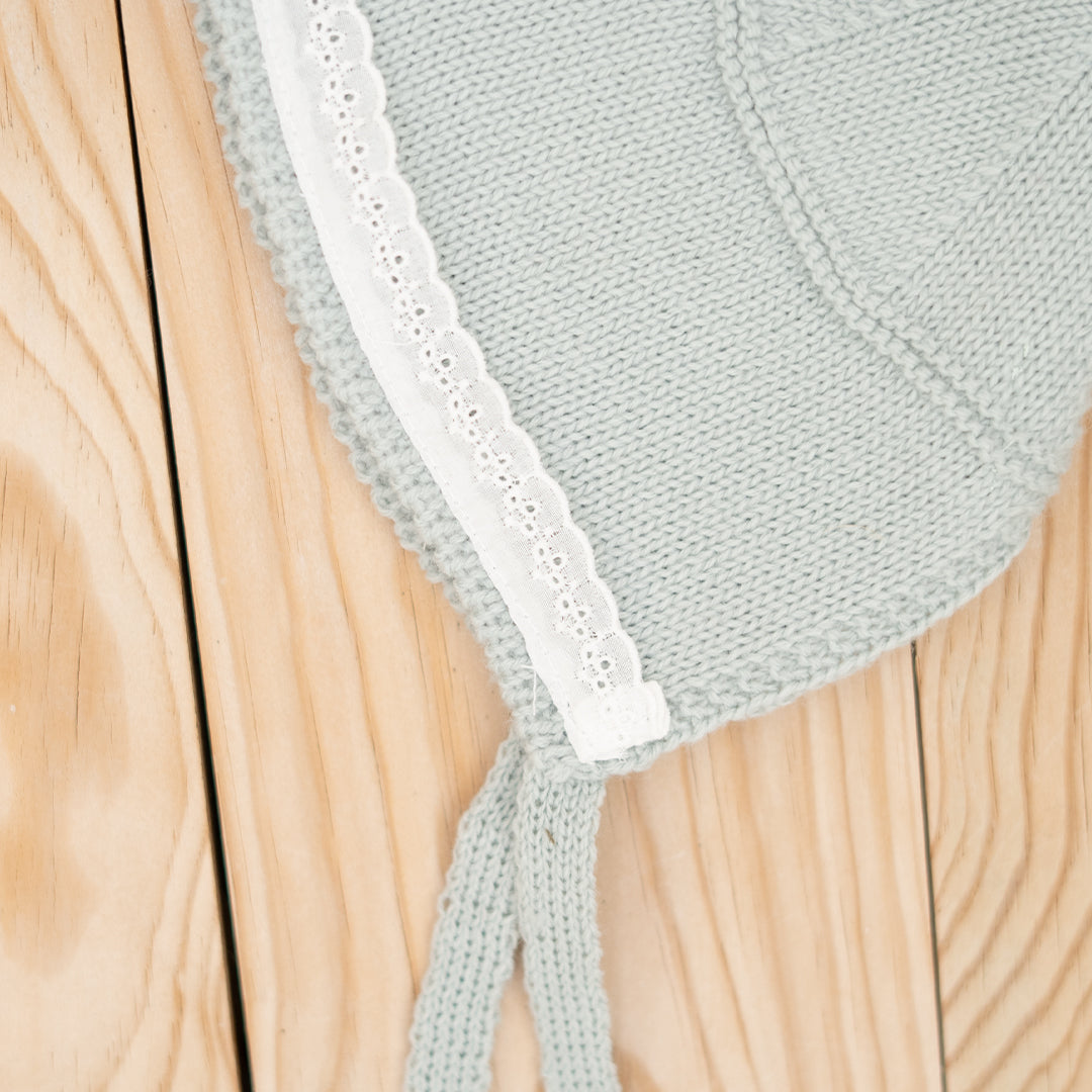 Capota de punto tricot para bebés con detalle de puntilla. Ideal para vestir y elevar los looks. Calentita y suave. Tiene lazada al cuello para que se ajuste perfectamente a su carita y no se le caiga. Disponible en varios colores.