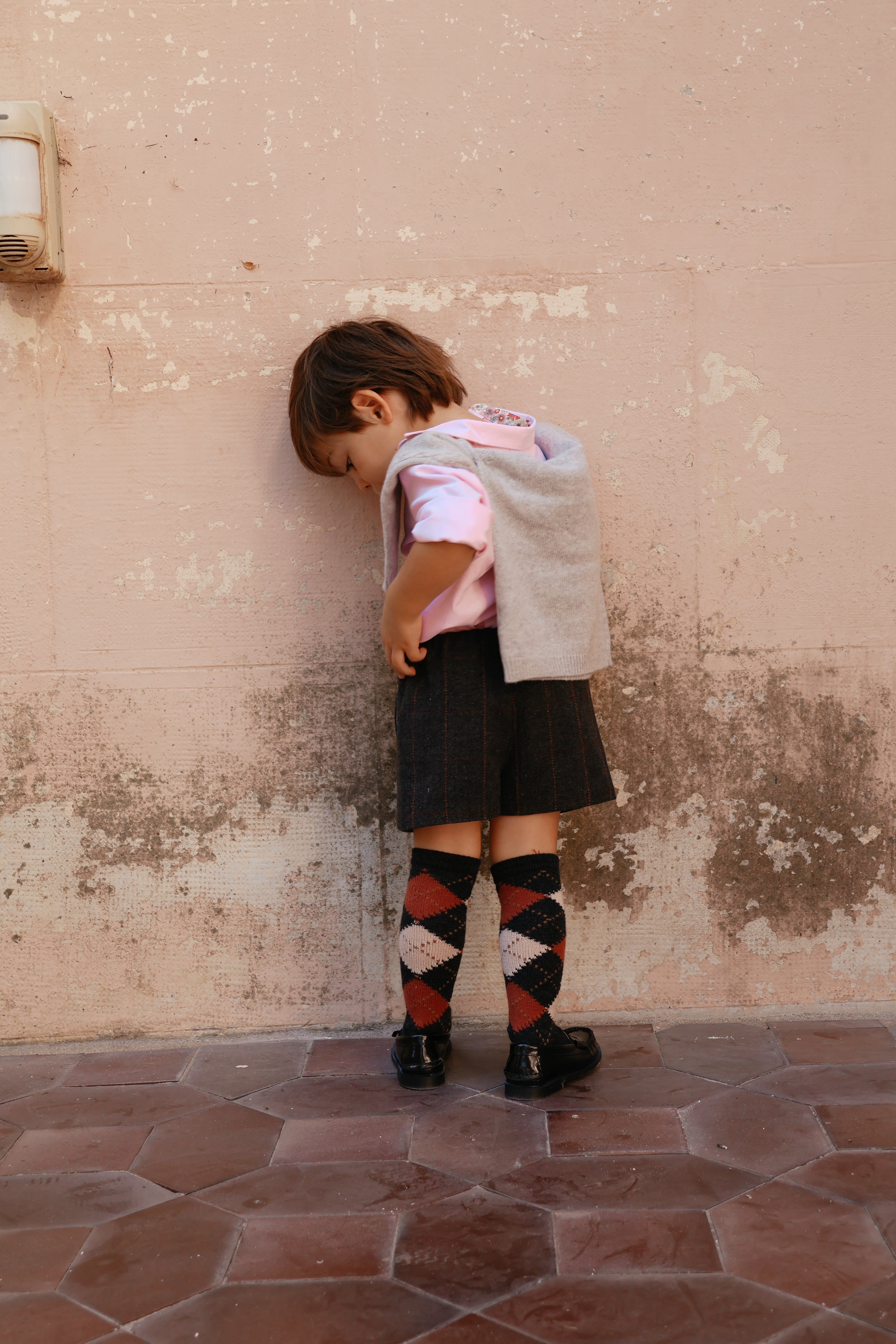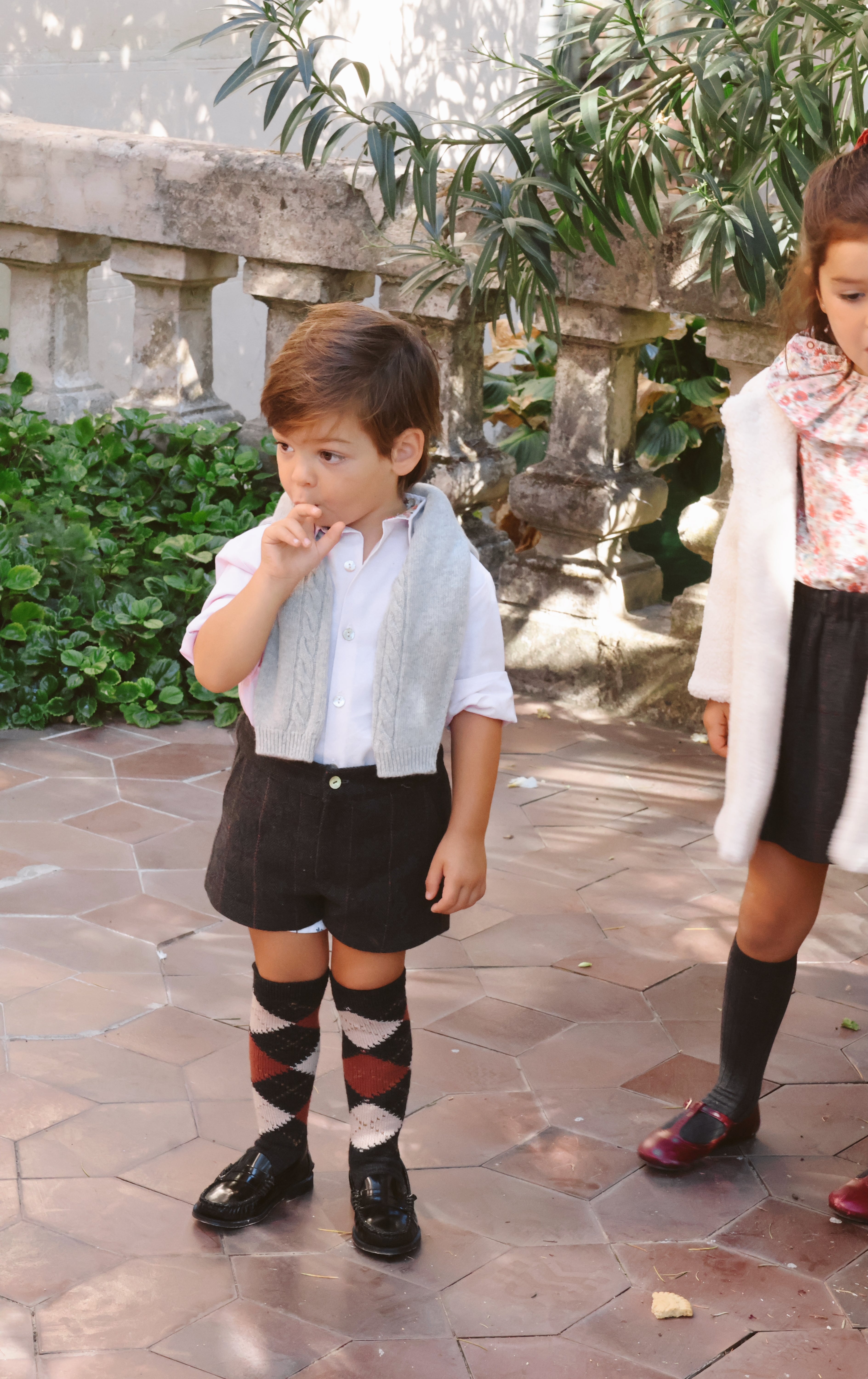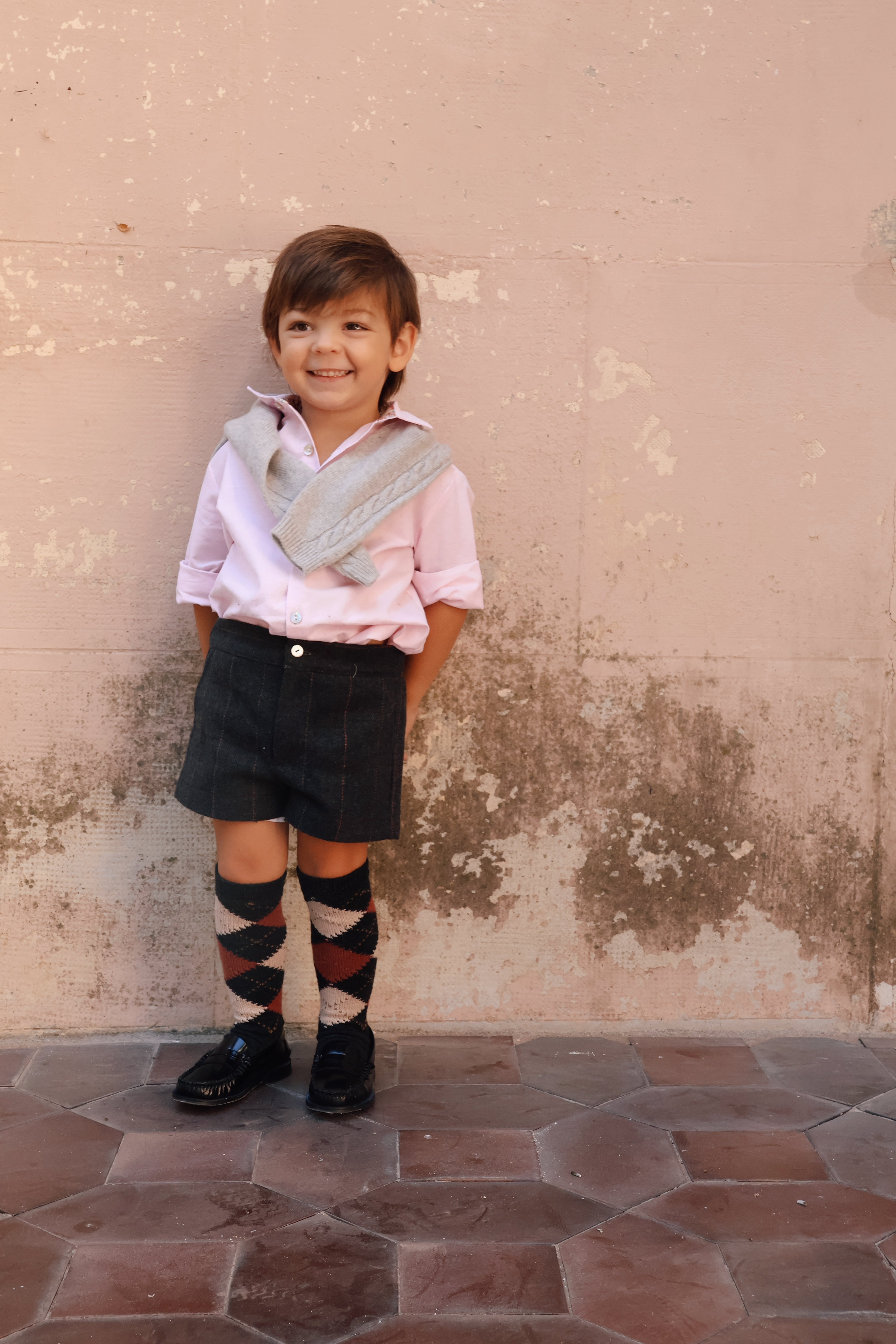 Pantalón corto en tejido lanoso de espiga gris. Tiene bolsillos, botón delantero y cremallera, así como gomas ajustables en el interior de la cinturilla para adaptarlo perfectamente a su cuerpecito. Una prenda súper combinable y elegante para los más pequeños.