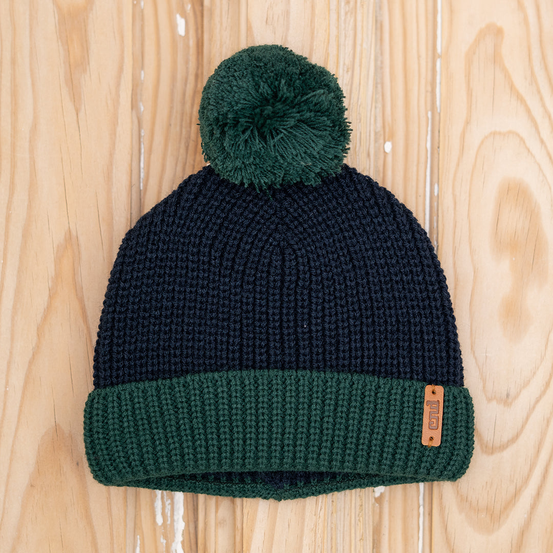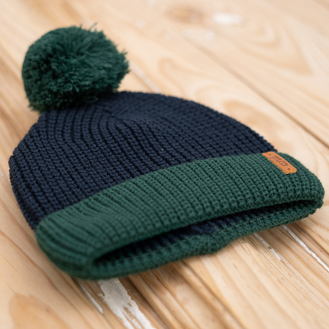 Gorro bicolor de punto tricot en azul marino y verde botella. Ideal para darle un aire cool a sus looks y que además esté súper calentito.