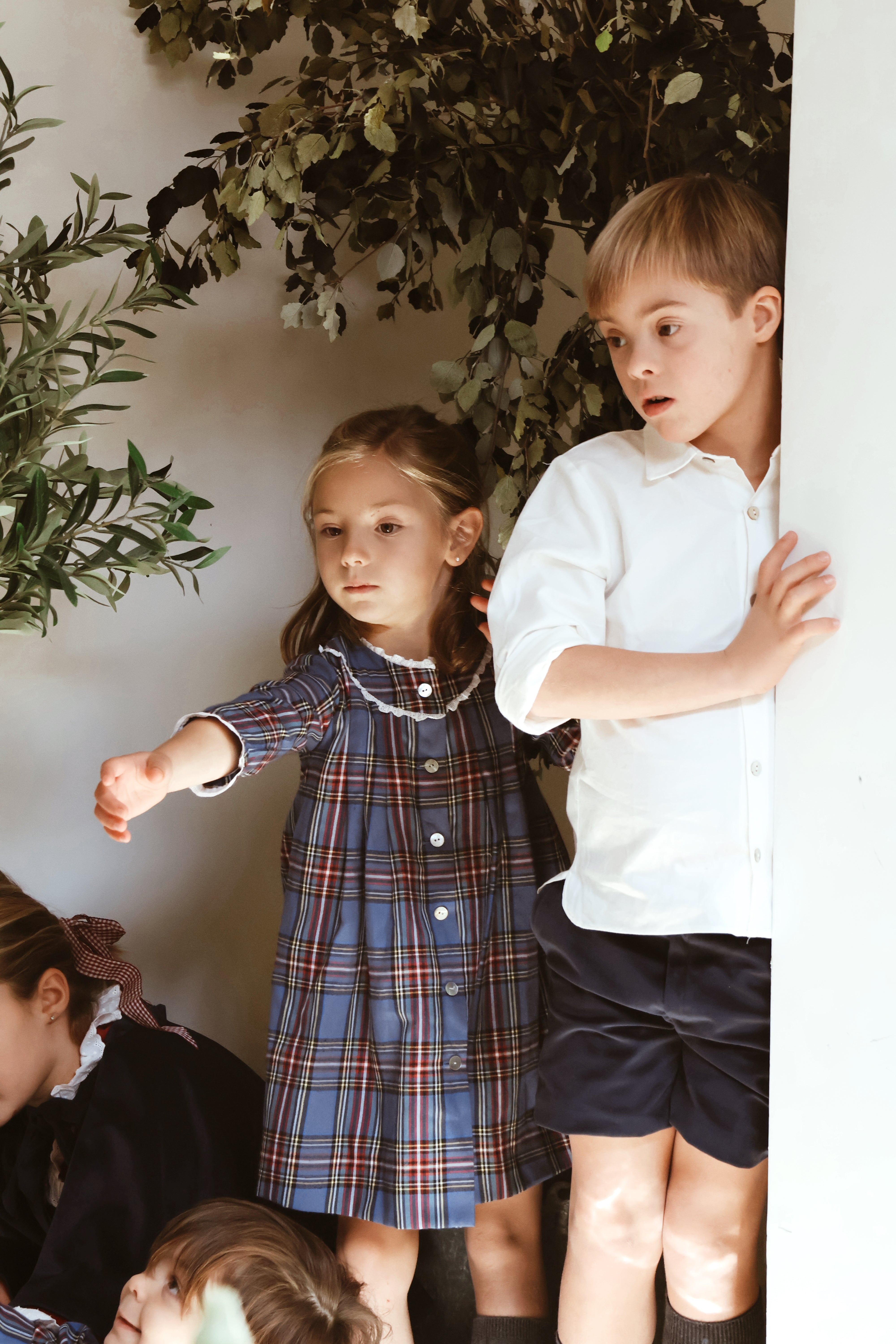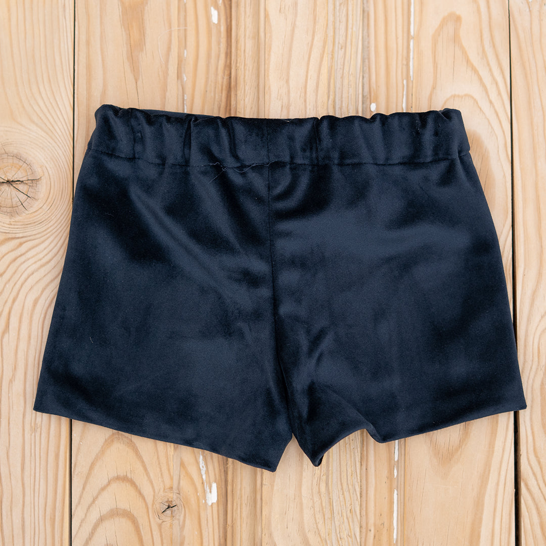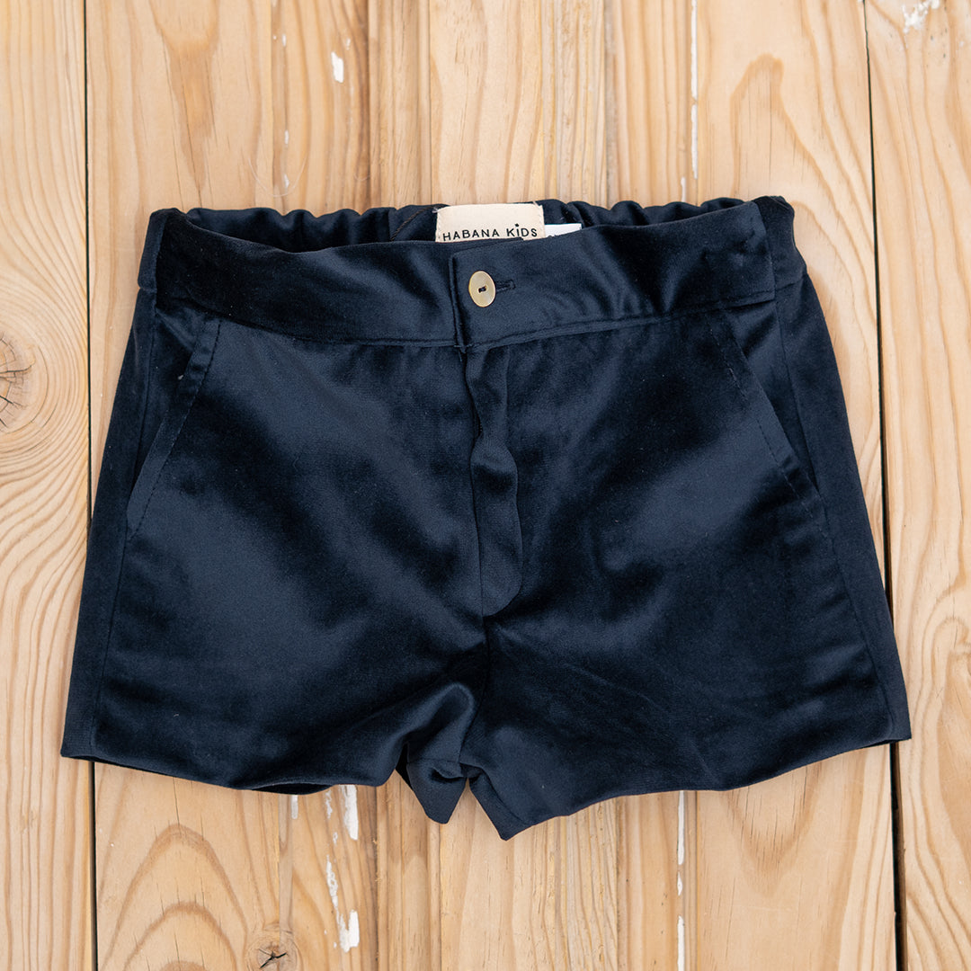 Pantalón corto de terciopelo azul marino. Tiene bolsillos, botón delantero y cremallera, así como gomas ajustables en el interior de la cinturilla para adaptarlo perfectamente a su cuerpecito. Una prenda súper combinable y elegante para los más pequeños.