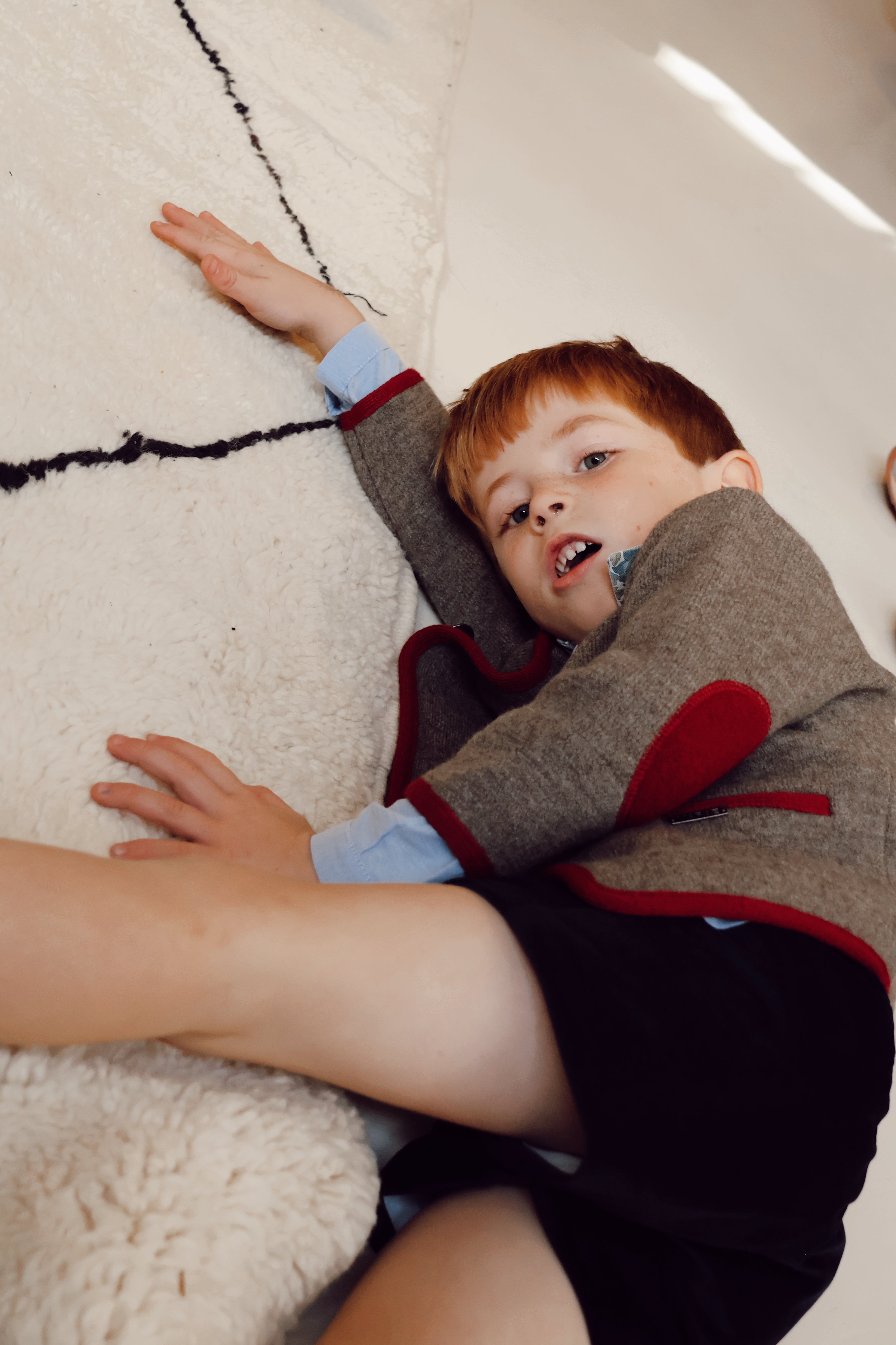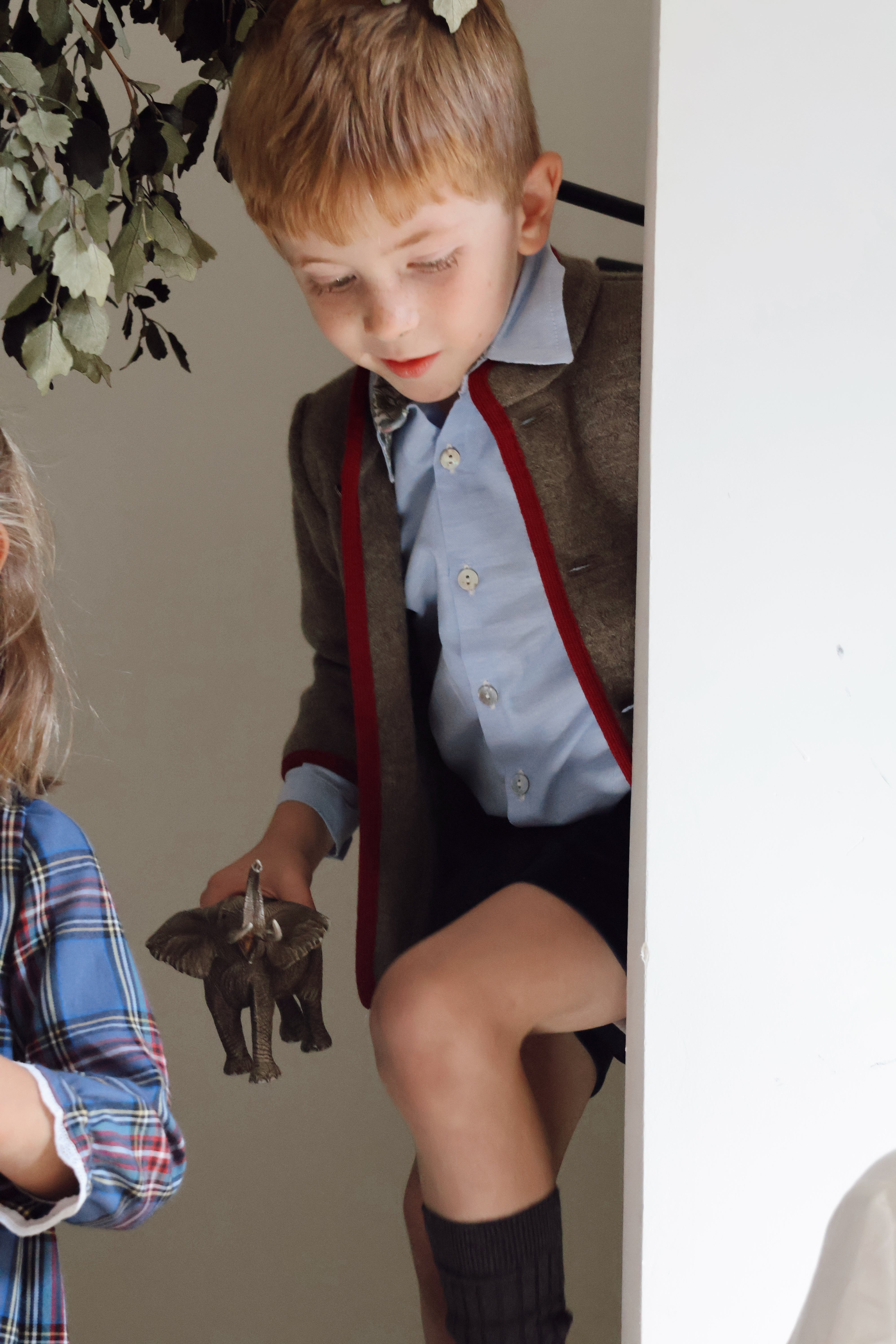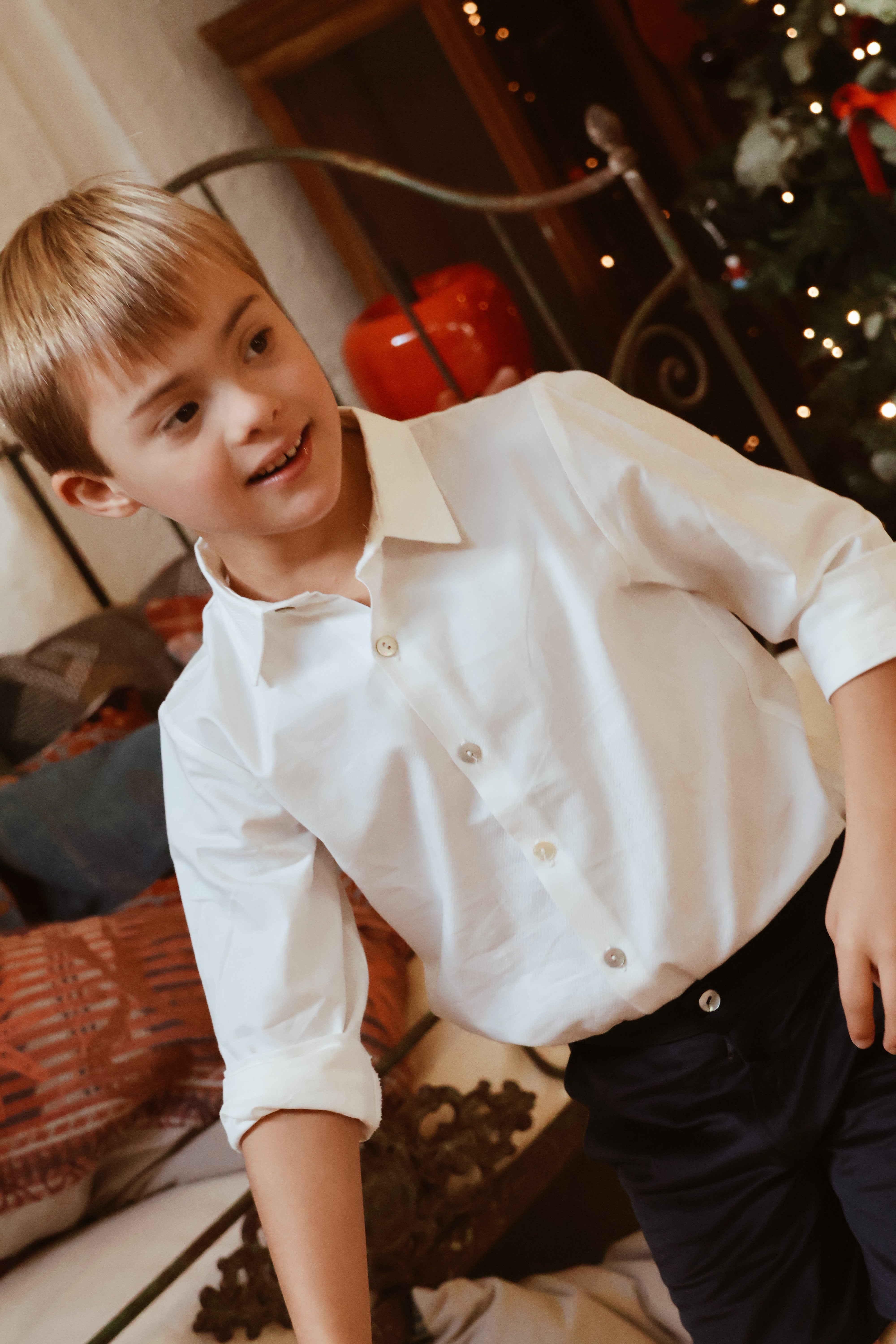 Pantalón corto de terciopelo azul marino. Tiene bolsillos, botón delantero y cremallera, así como gomas ajustables en el interior de la cinturilla para adaptarlo perfectamente a su cuerpecito. Una prenda súper combinable y elegante para los más pequeños.