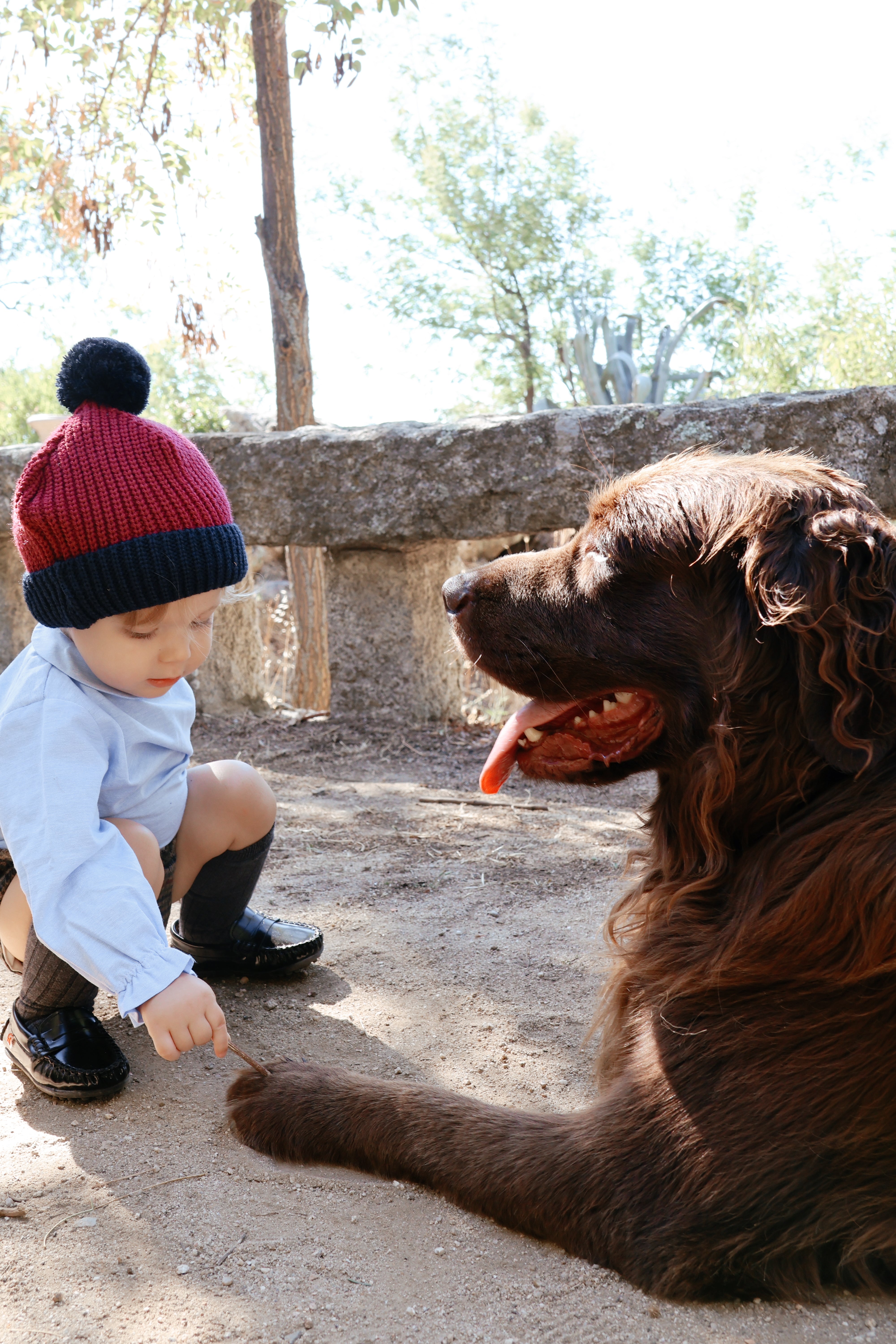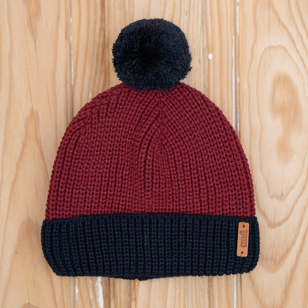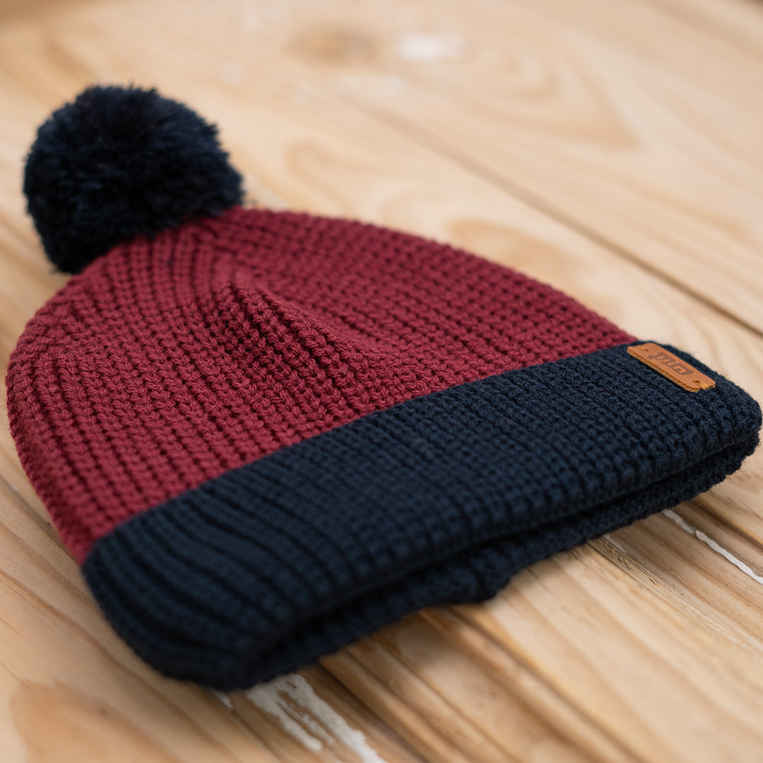Gorro pompón bicolor de punto tricot en azul marino y burdeos. Ideal para darle un aire cool a sus looks y que además esté súper calentito.