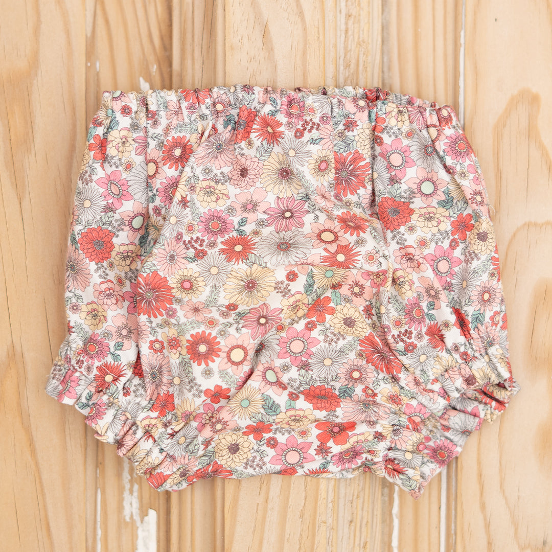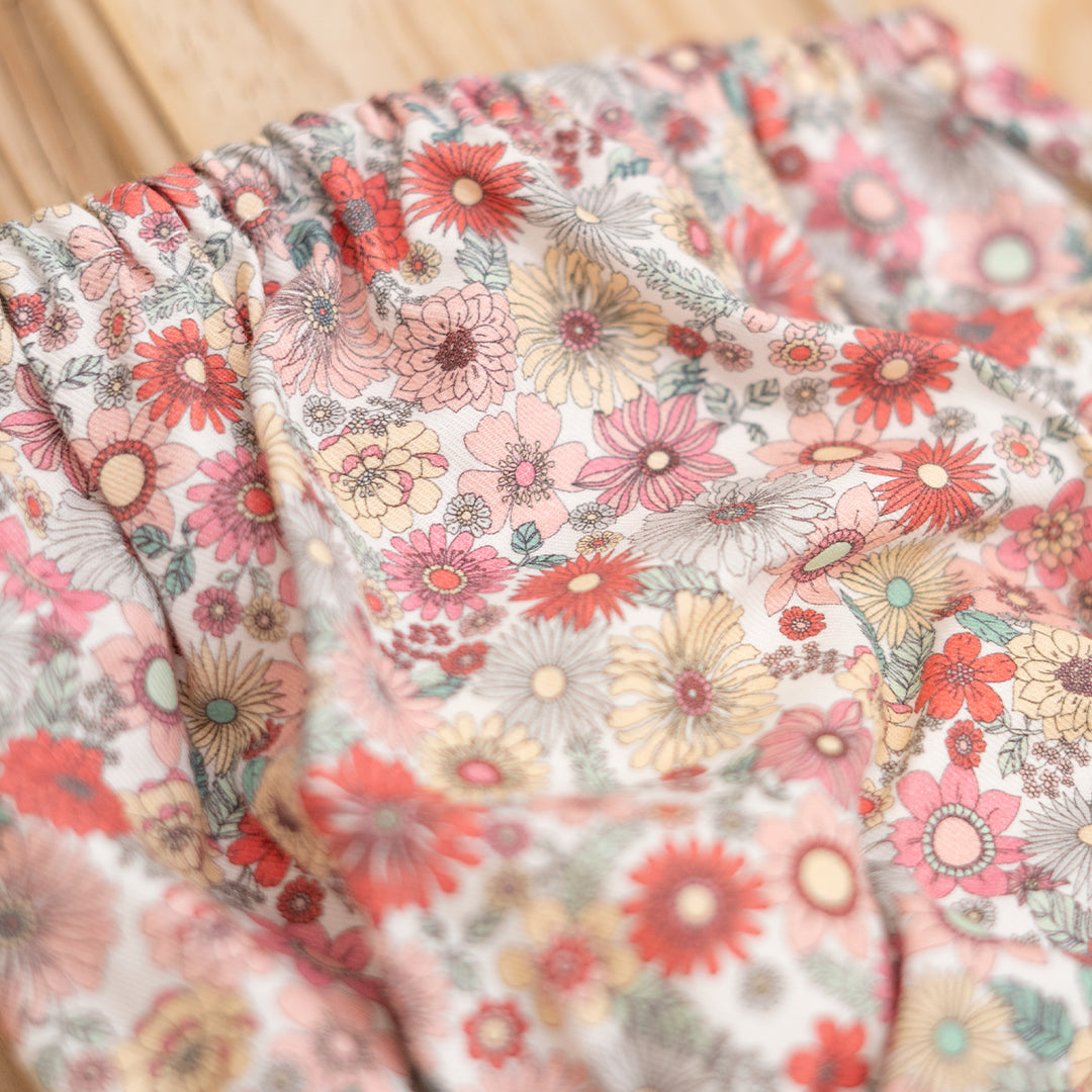 Cubrepañal engomado en tejido estampado de flores en tonos burdeos. Gomas blanditas y suaves que no aprietan a los bebés. Forrado