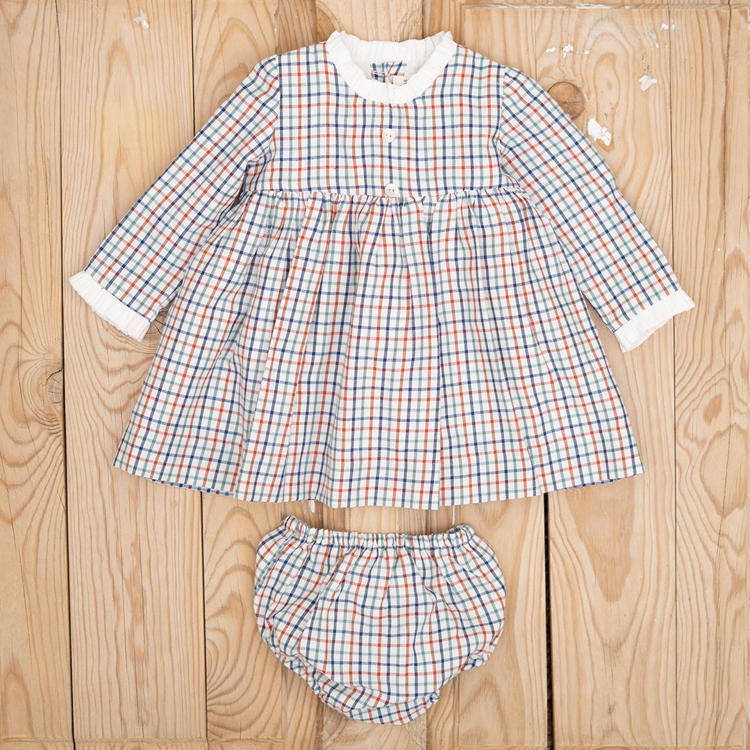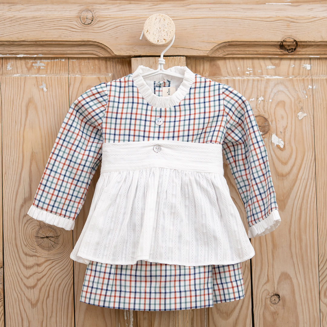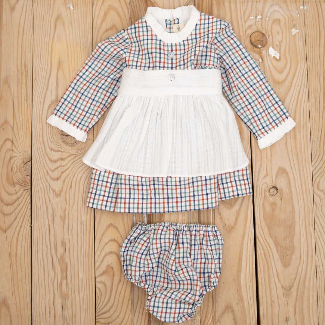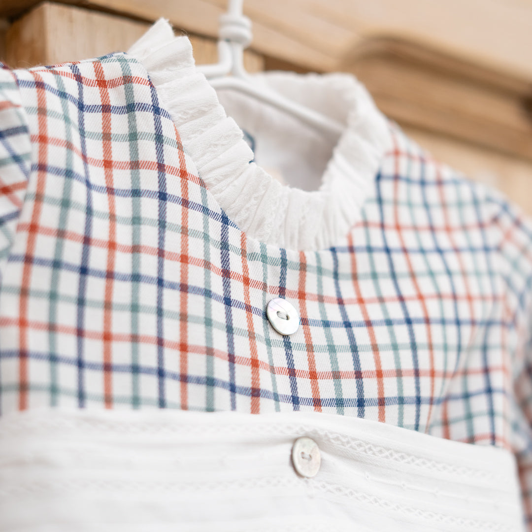 Conjunto de jesusito estilo tirolés y cubre de cuadros en tonos granates, azules y verdes sobre fondo blanco. Delantal y volantes de cuello y puños en tejido contraste, falso liso blanco. El vestido se puede utilizar sin delantal o con el dándole un aire austriaco de lo más favorecedor. Nos encanta para diario o con complementos más arreglados para los días especiales de invierno.