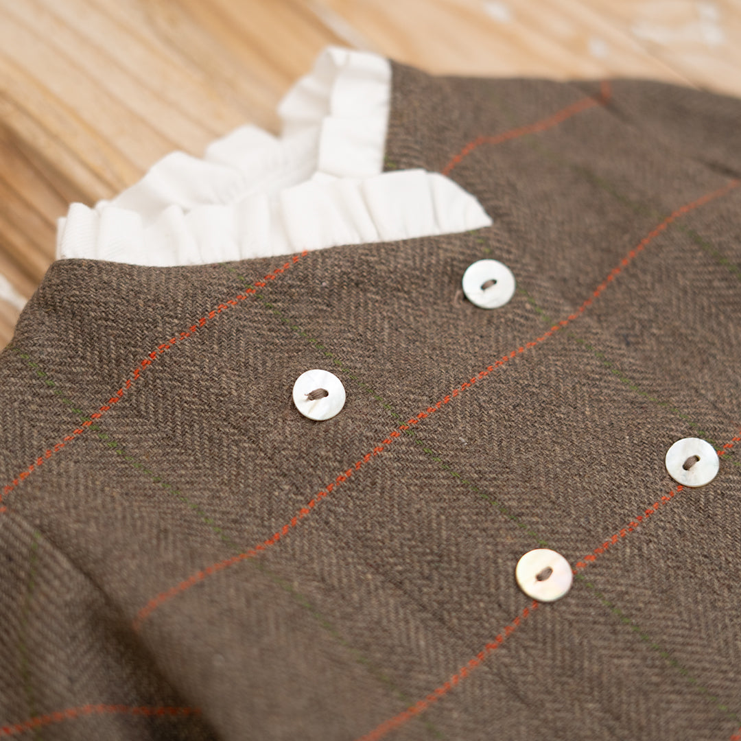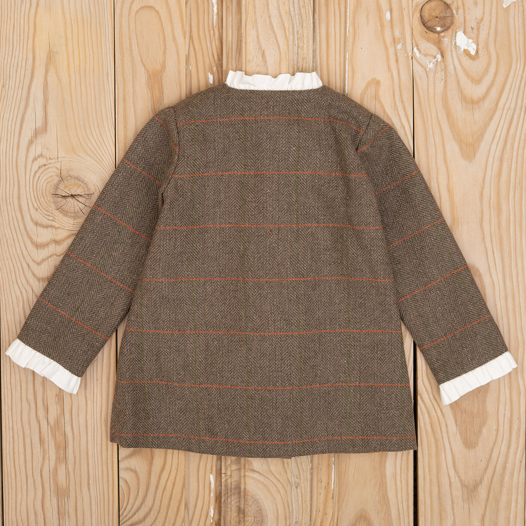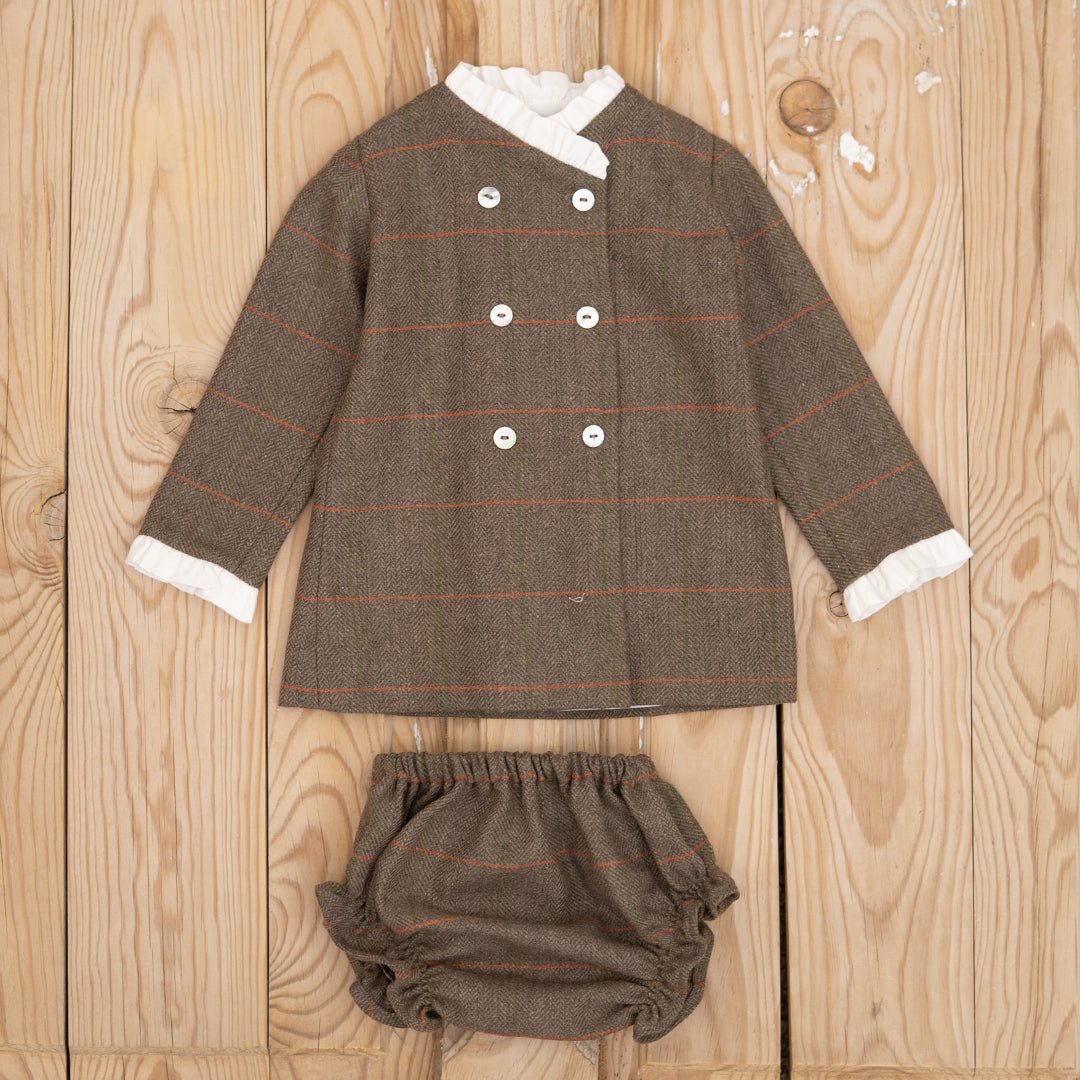 Jesusito cruzado en tejido lanoso de espiga marrón, ribeteado con volantito de popelín blanco alrededor del cuello, cruce delantero y puños. Muy favorecedor y calentito. Incluye cubre a juego.