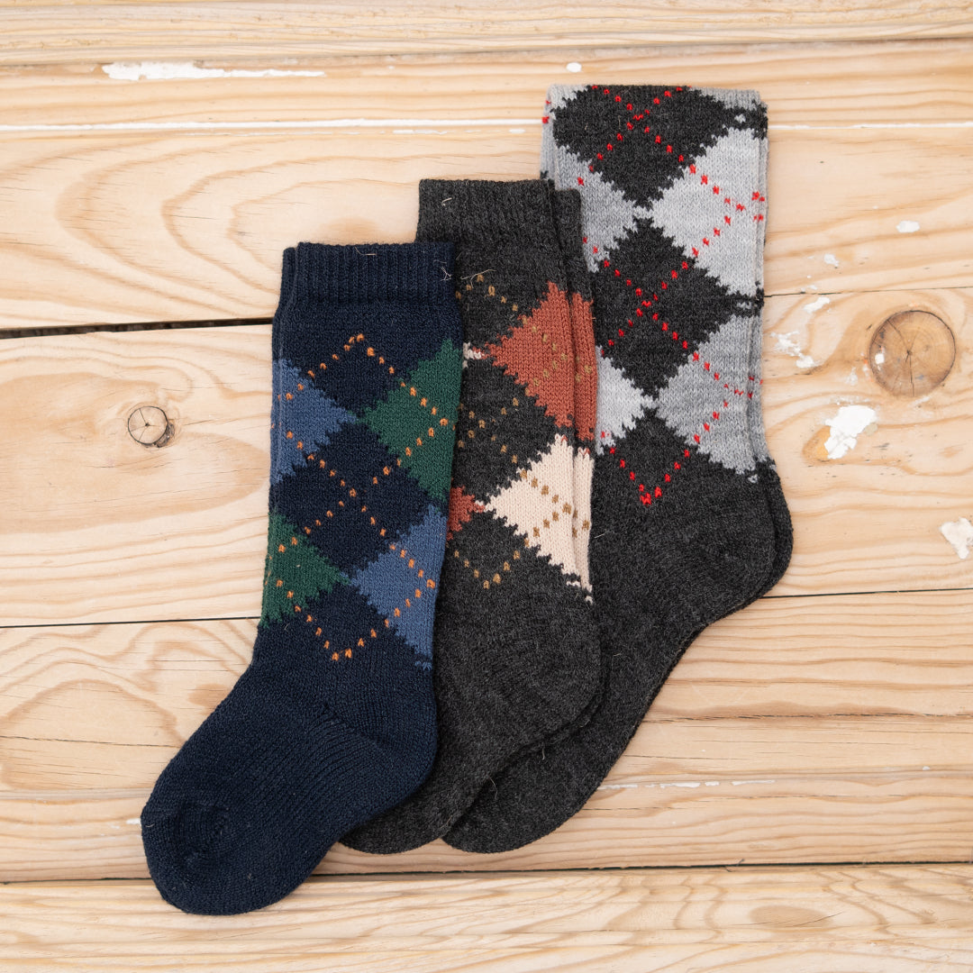 Calcetines clásicos intarsia de rombos en grises de la marca Cóndor. Súper estilosos, calentitos y suaves.