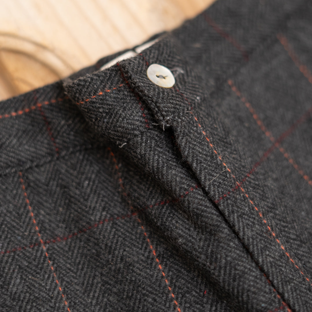 Pantalón largo en tejido lanoso de espiga gris. Ideal, estiloso y calentito para los días de otoño invierno. Muy estiloso y favorecedor, con bolsillos en delantero. Cinturilla de goma en espalda y goma elástica ajustable interior. Bolsillos laterales funcionales y cierre con cremallera y botón.