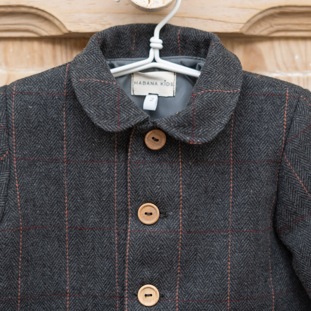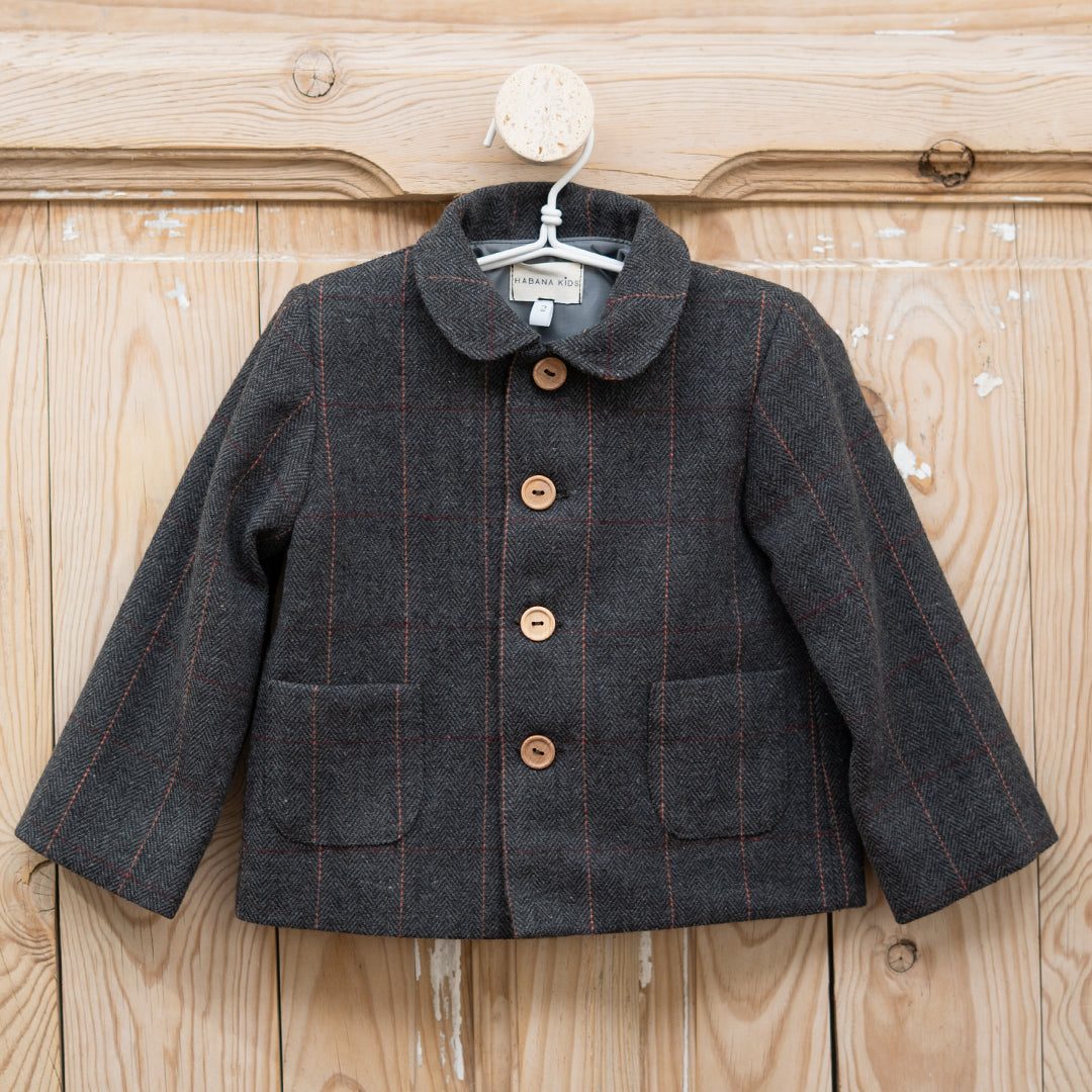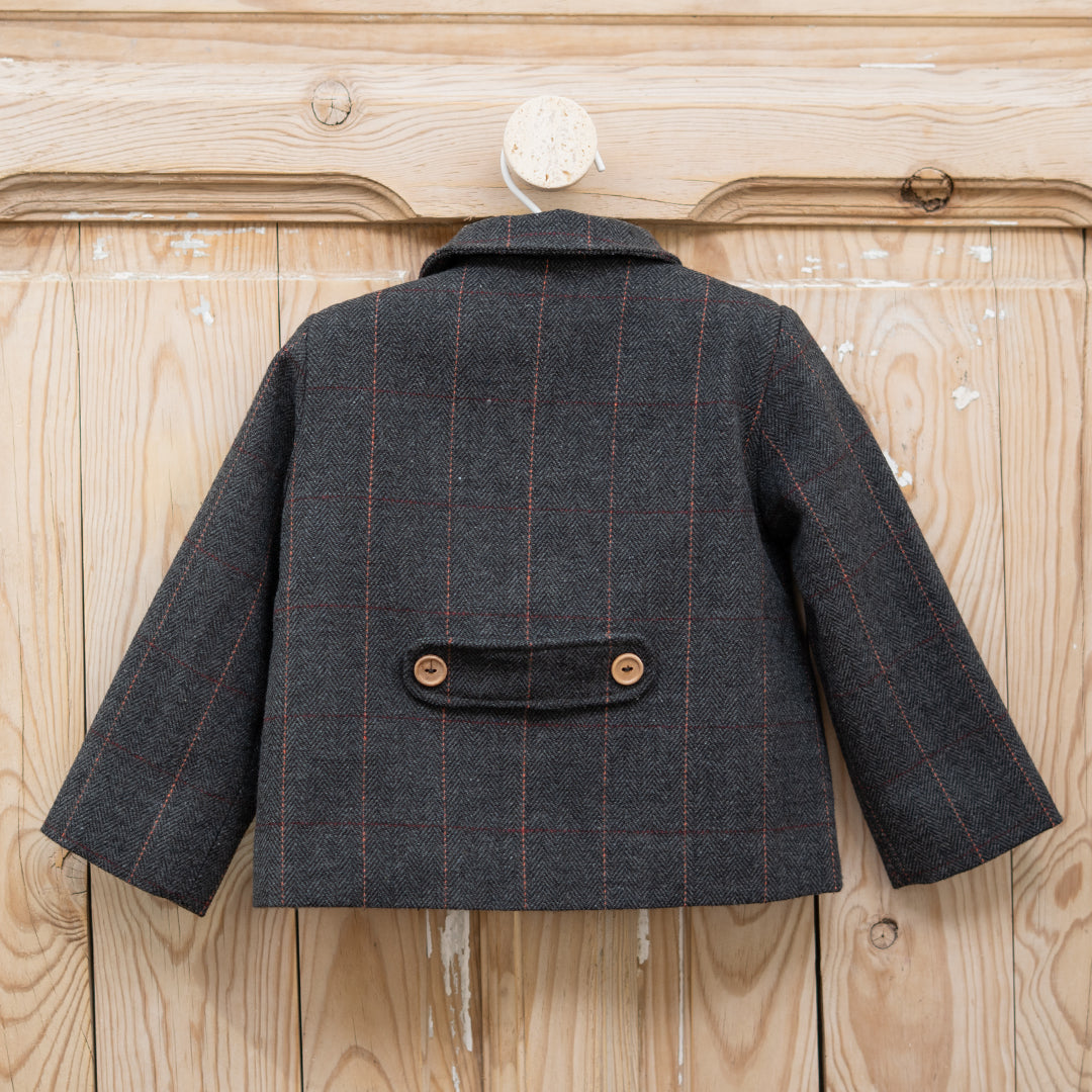 Preciosa austriaca en espiga gris con finos cuadros en burdeos para los más pequeños. Ideal cuello bebé. Pertenece a la colección Granadas y flores, en la que hay prendas para combinar a todos los hermanos. También disponible en cuello mao.