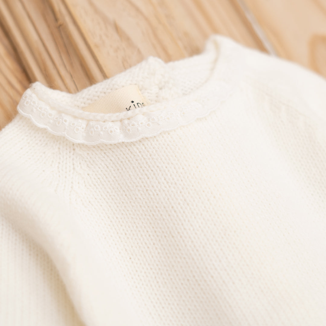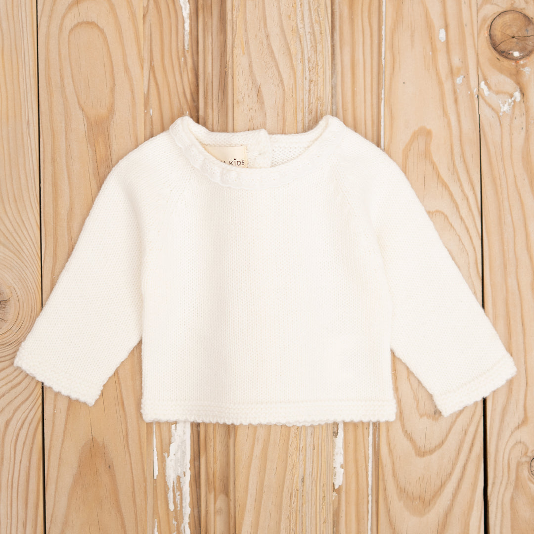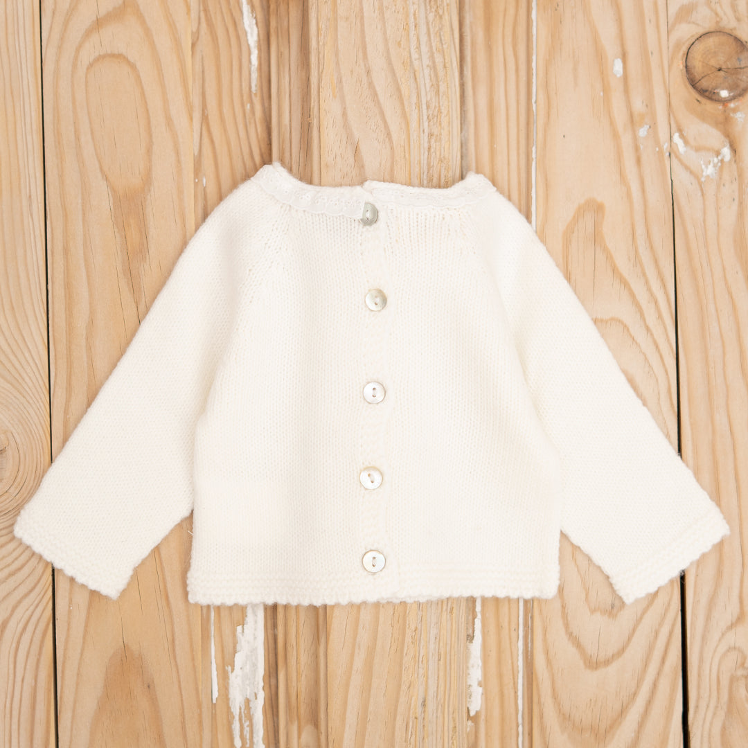 Monísimos jersey para bebés con delicada puntilla de algodón en el cuello. Detalle de efecto canalé horizontal en puños y bajo. Se abotona en espalda de arriba abajo para facilitar la puesta. Disponible en varios colores.