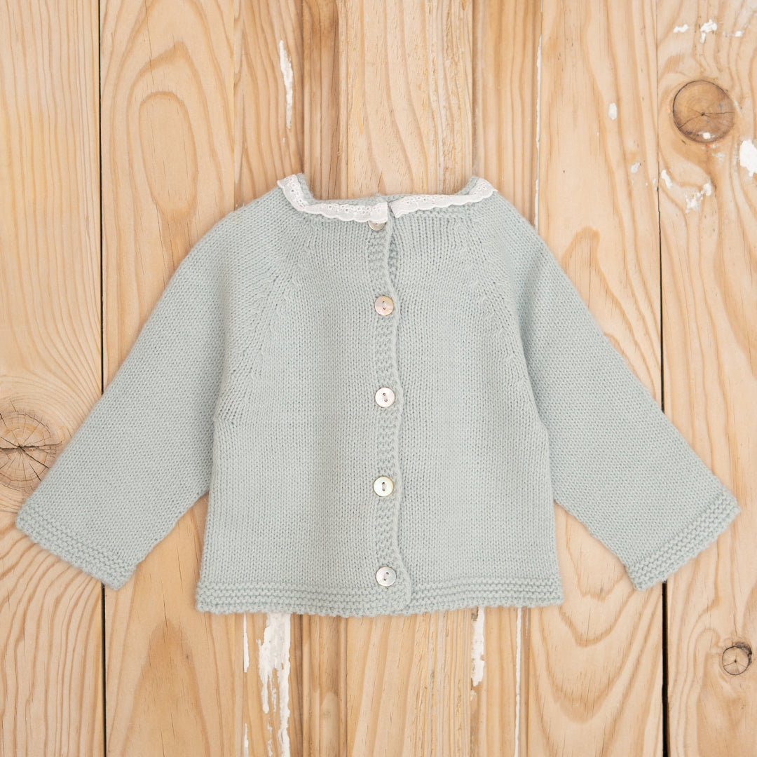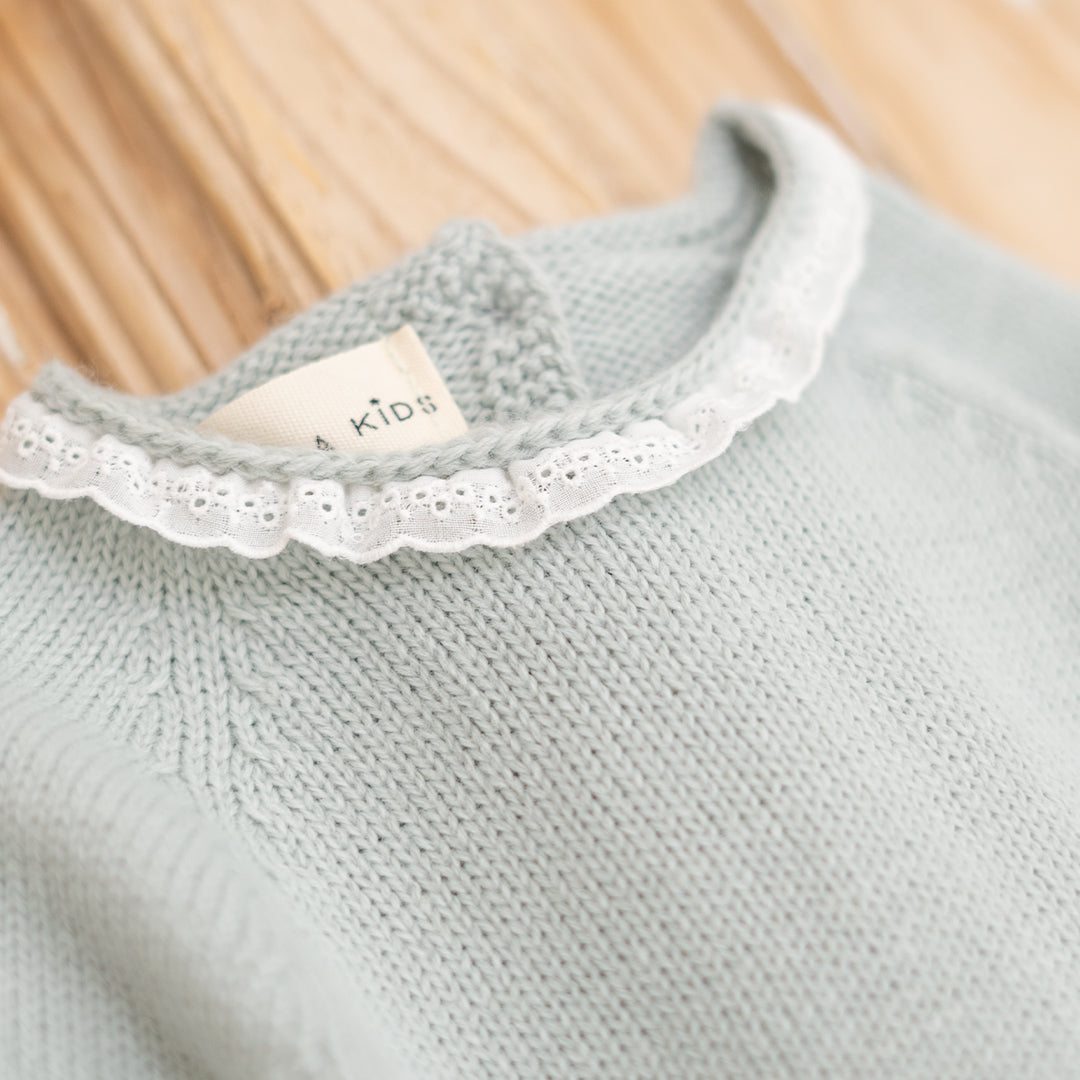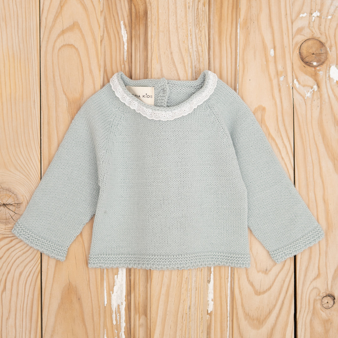 Monísimos jersey para bebés con delicada puntilla de algodón en el cuello. Detalle de efecto canalé horizontal en puños y bajo. Se abotona en espalda de arriba abajo para facilitar la puesta. Disponible en varios colores.