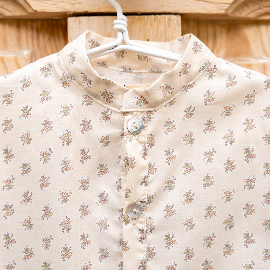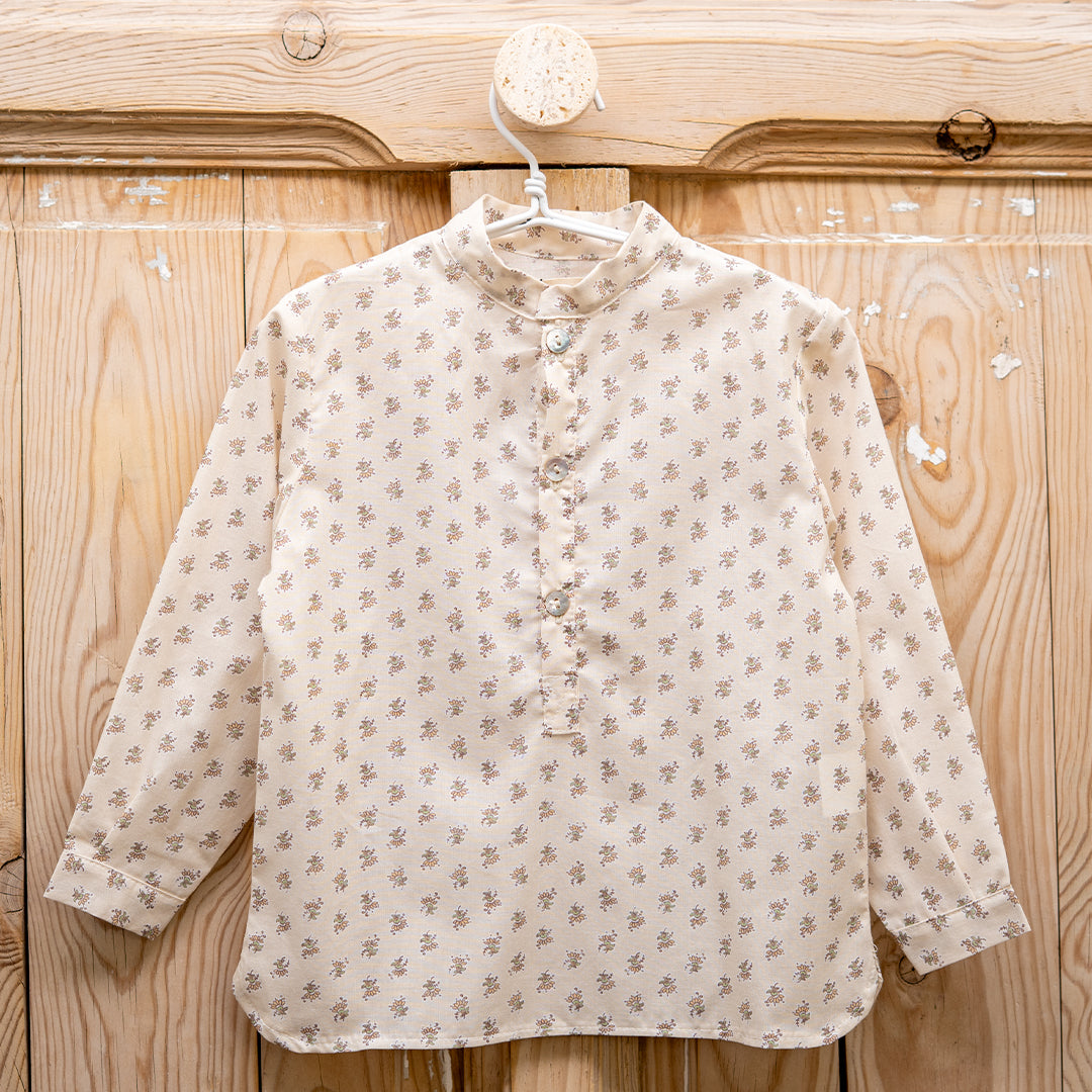 Camisa tipo polera, de cuello mao en nuestro estampado campanilla muy fresquito. Manga larga terminada con puño y botón. Perfecta para combinar hermanos de cualquier edad con mismo estampado de la colección.