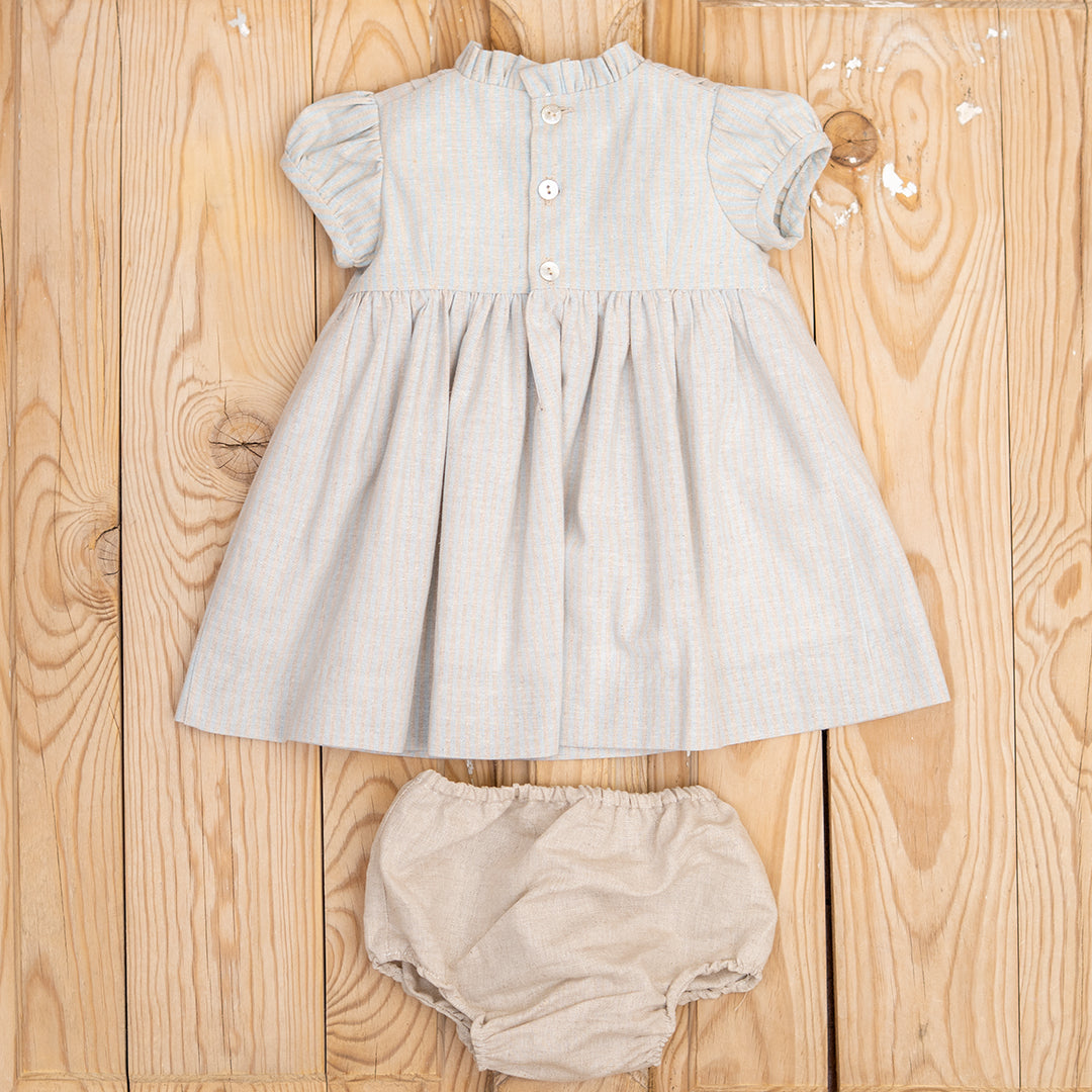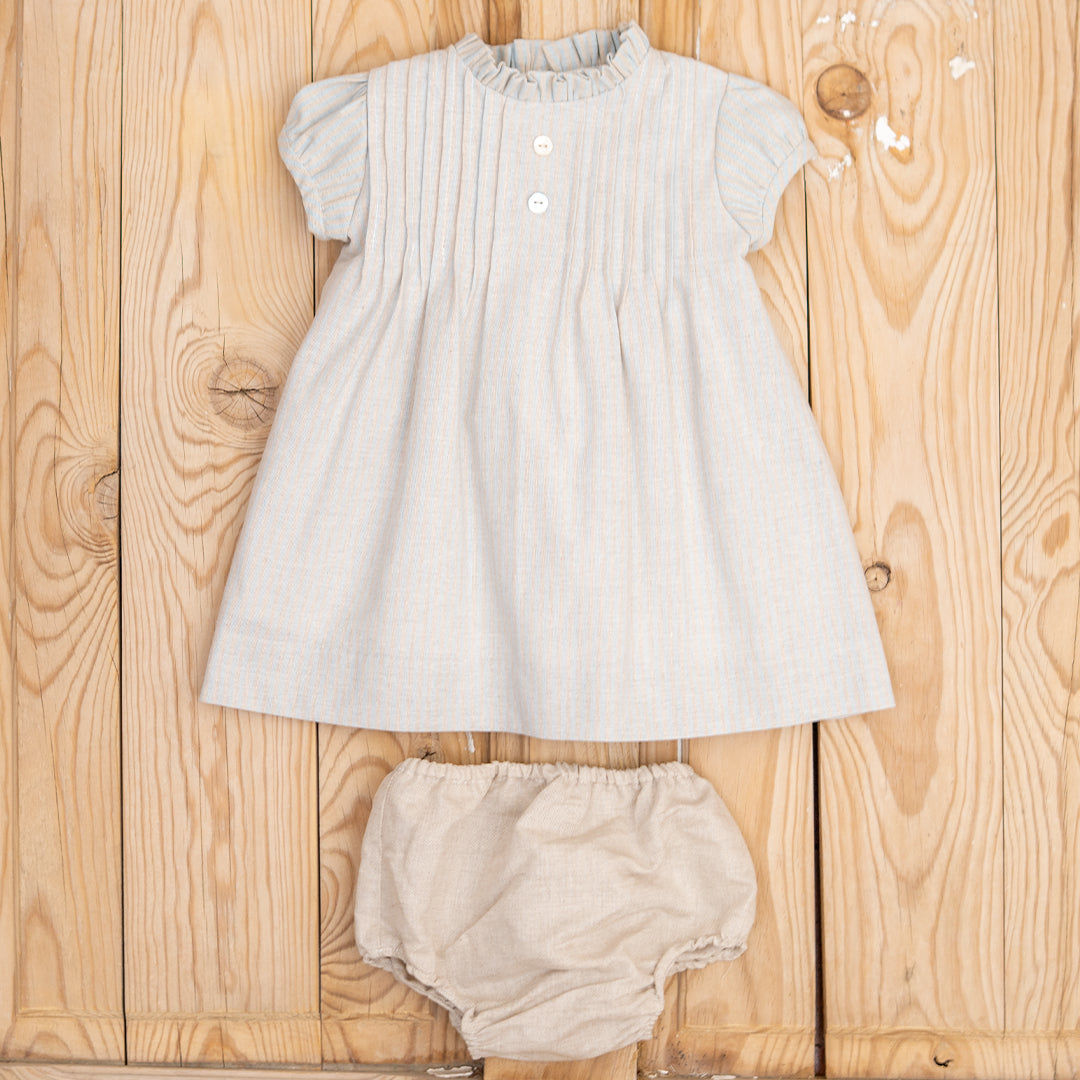 Conjunto en tejido rústico de rayas color azul clarito y tostado, cubrepañal en tono tostado a contraste. La prenda tiene jaretas en el pecho con dos botones de nácar, volante en el cuello y manga cortita tipo farol. Se abotona en espalda de arriba abajo. Además, la prenda va forrada para que siente mejor. Prenda muy versátil que sirve para eventos o para el día a día en función a los zapatos con los que se combine.