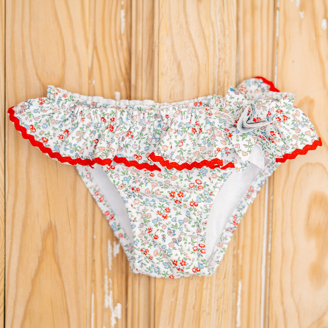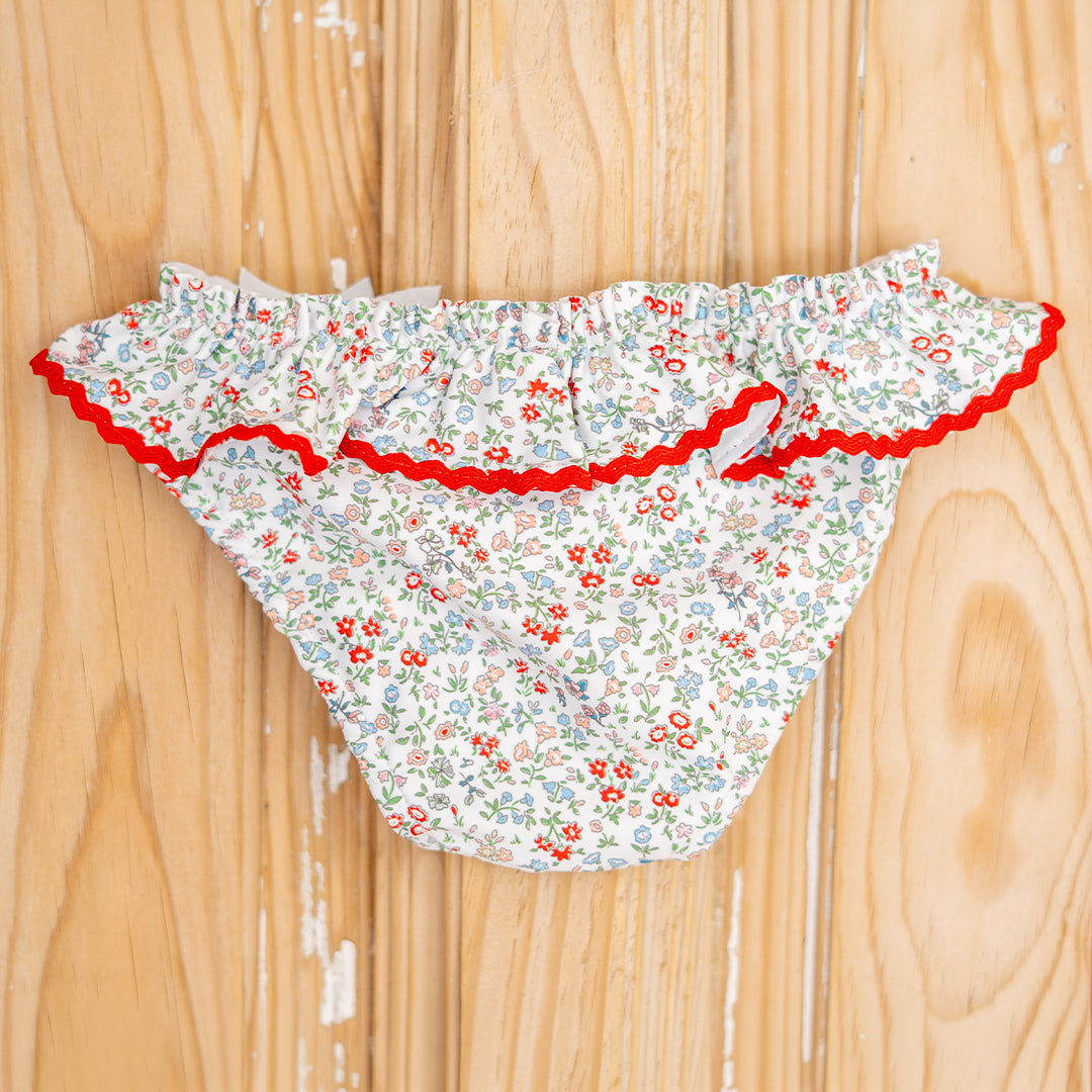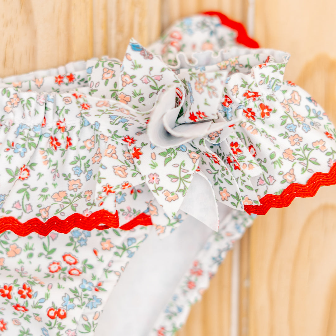 Culetín de niña con goma en la cintura para ajustar. El estampado es de flores multicolor con fondo blanco, muy favorecedor. En la cintura lleva un remate con cinta ondulina y flor, haciéndolo aún más especial.