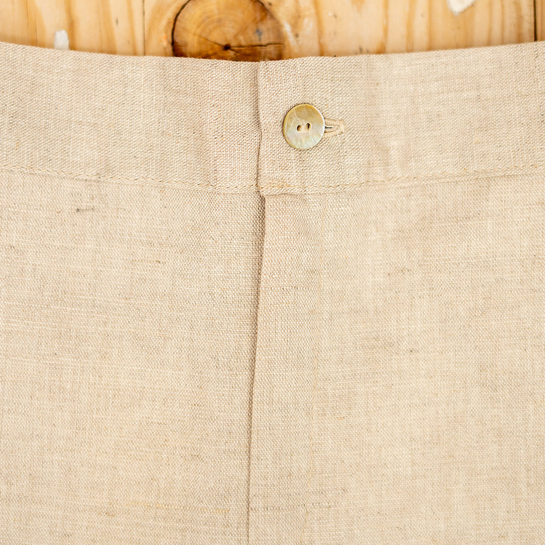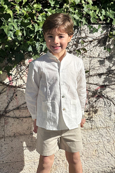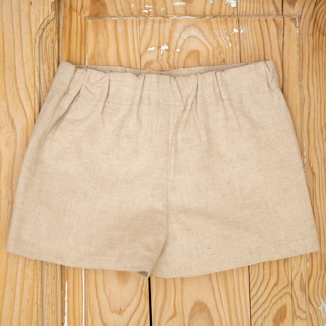 Pantalón corto color de lino beige, tejido muy fresquito y suave para los niños. Va forrada con tela de algodón 100%. Tiene bolsillos, botón delantero y cremallera, así como gomas ajustables en el interior de la cinturilla para adaptarlo perfectamente a su cuerpecito. Una prenda súper combinable y elegante para los más pequeños. Combina muy bien con la colección de rayas rústicas.