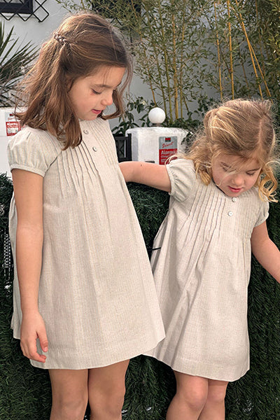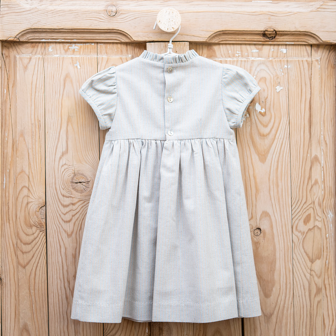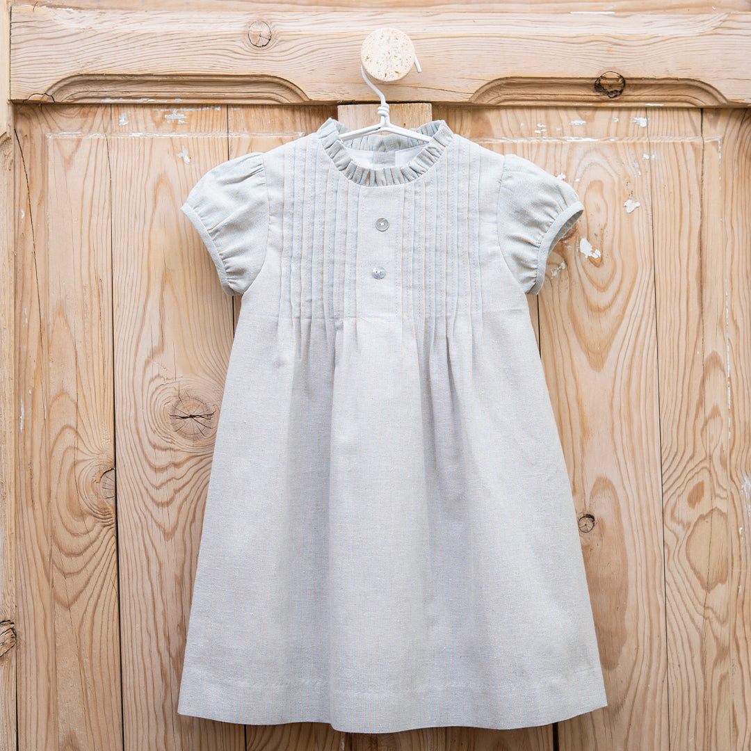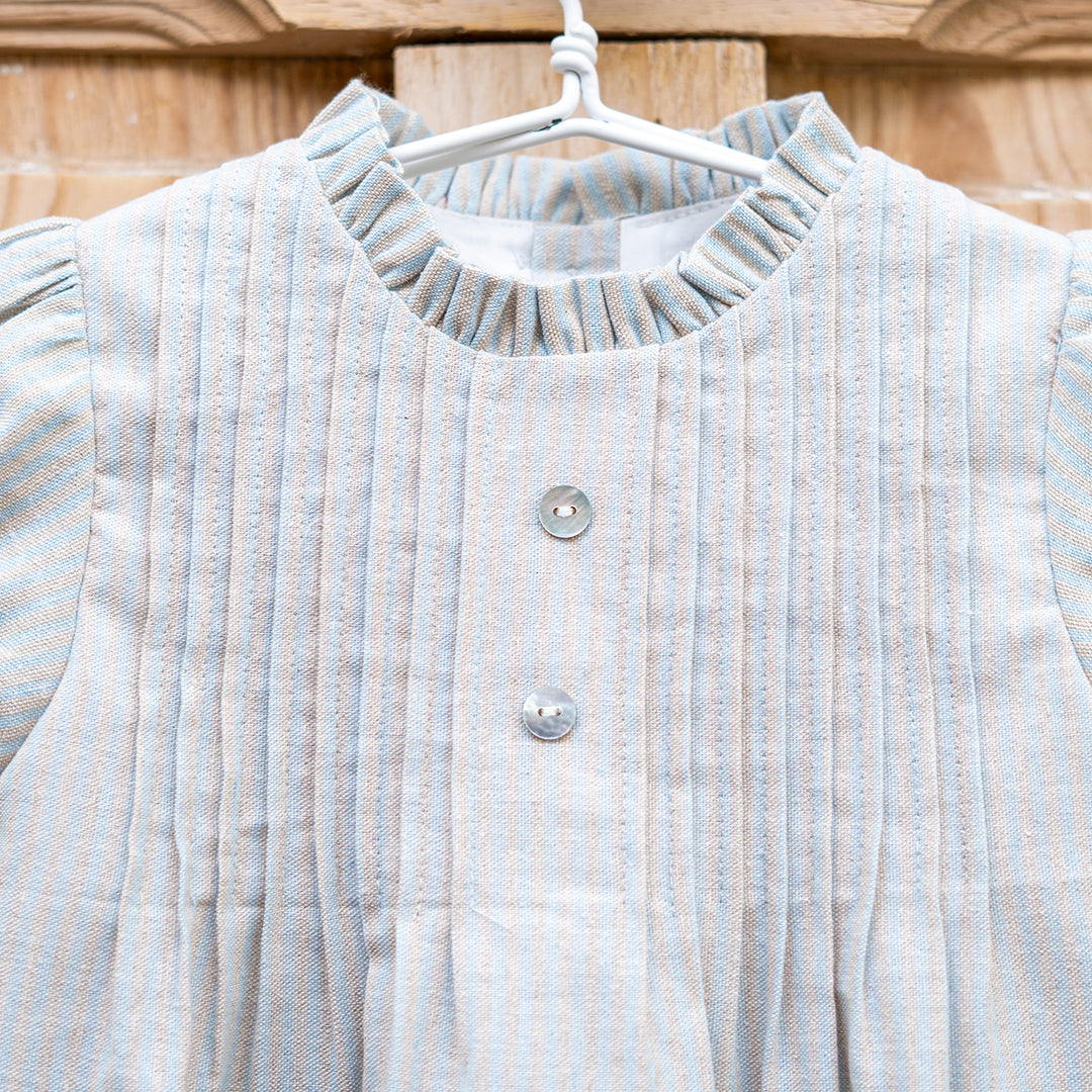 Vestido en tejido rústico de rayas color azul clarito y tostado. La prenda tiene jaretas en el pecho con dos botones de nácar, volante en el cuello y manga cortita tipo farol. Se abotona en espalda de arriba abajo. Además, la prenda va forrada para que siente mejor. Prenda muy versátil que sirve para eventos o para el día a día en función a los zapatos con los que se combine.