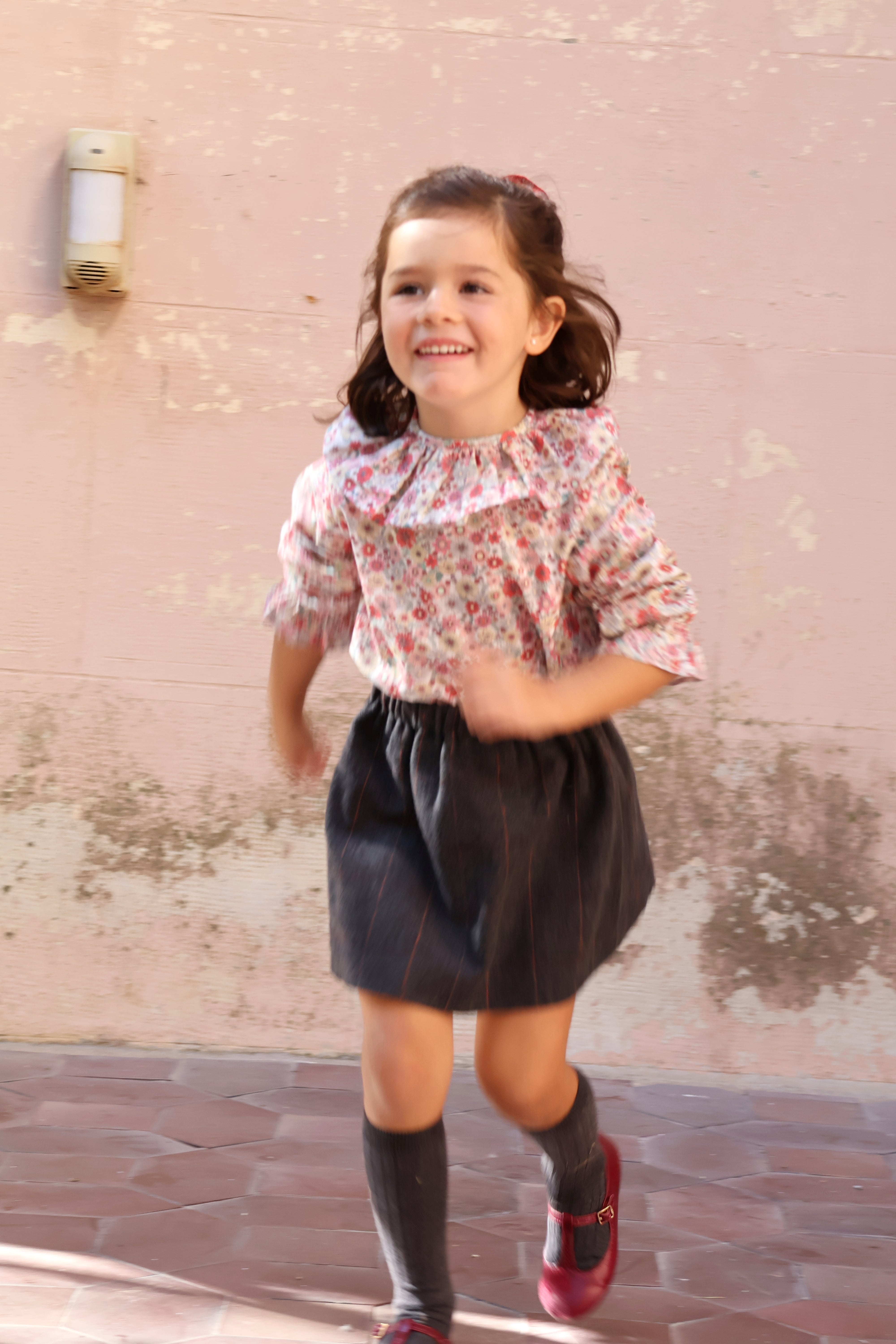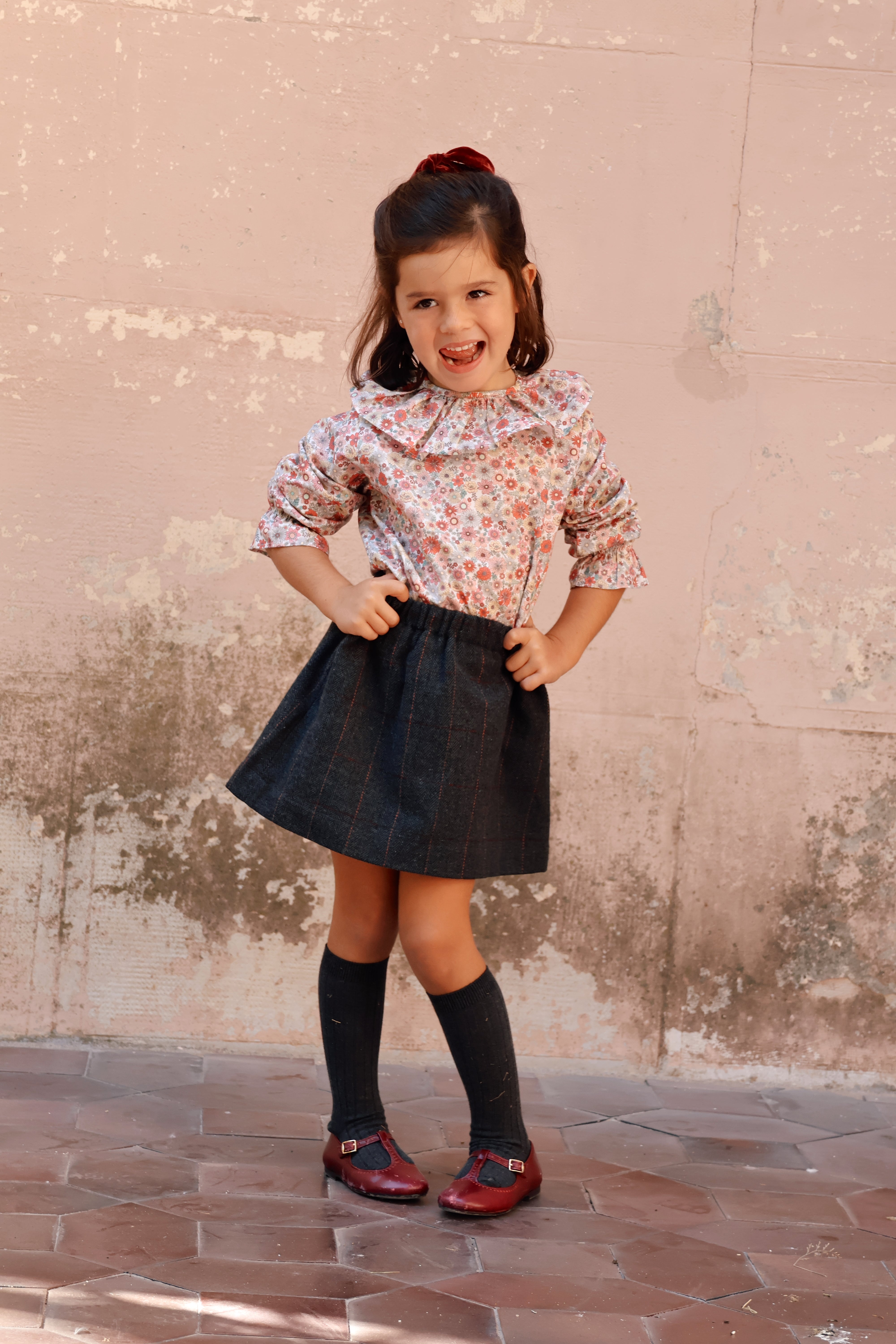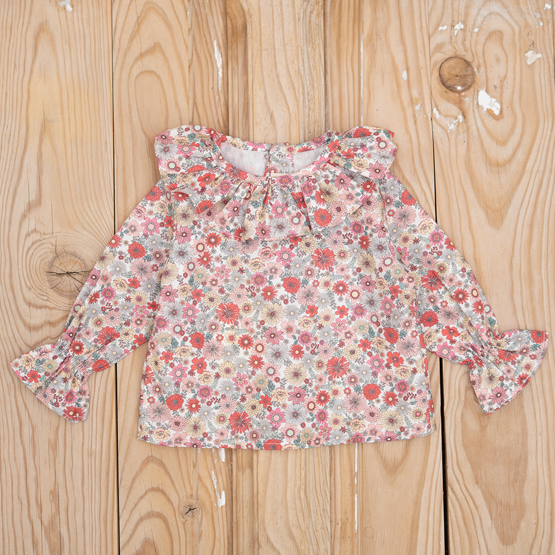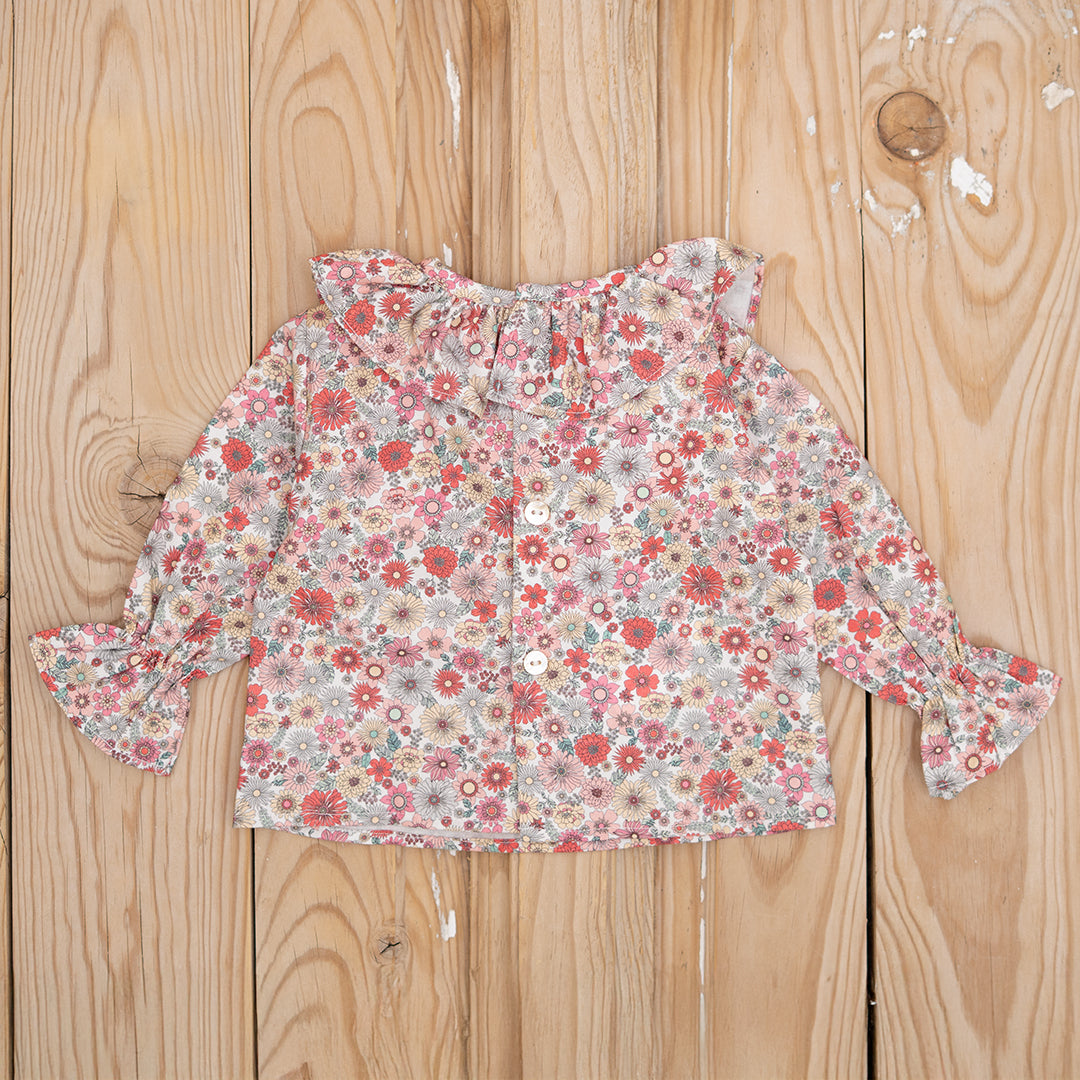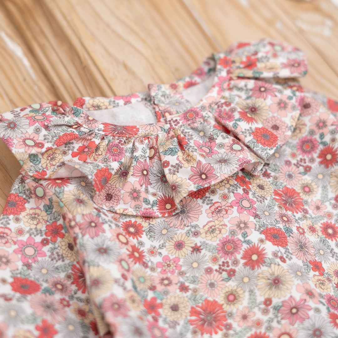Preciosa blusa de bebés con gran volante en el cuello. Ideal estampados de florecitas en tonos burdeos. Se abotona en espalda y termina las manguitas con puños de suave goma y volantito.