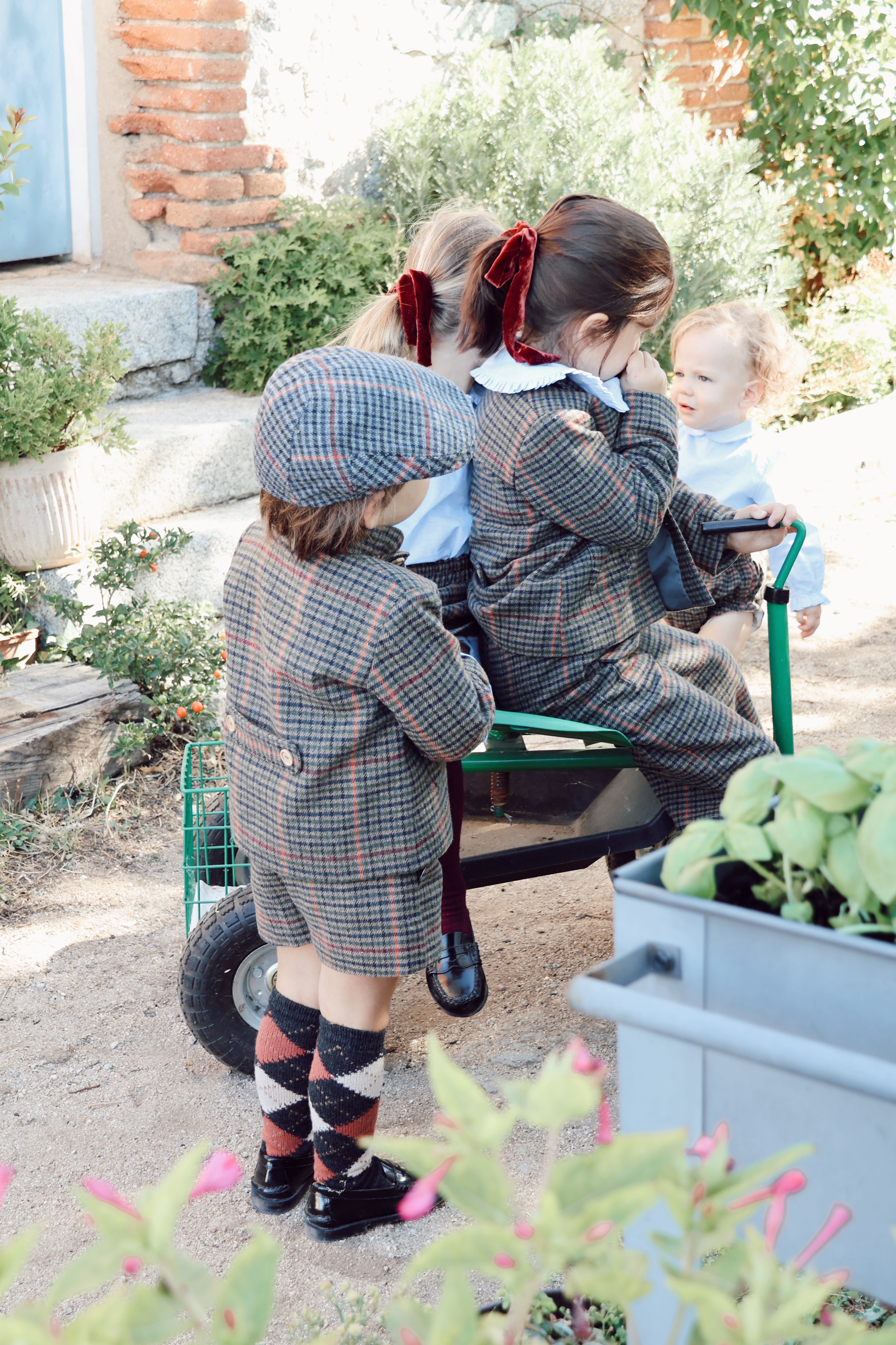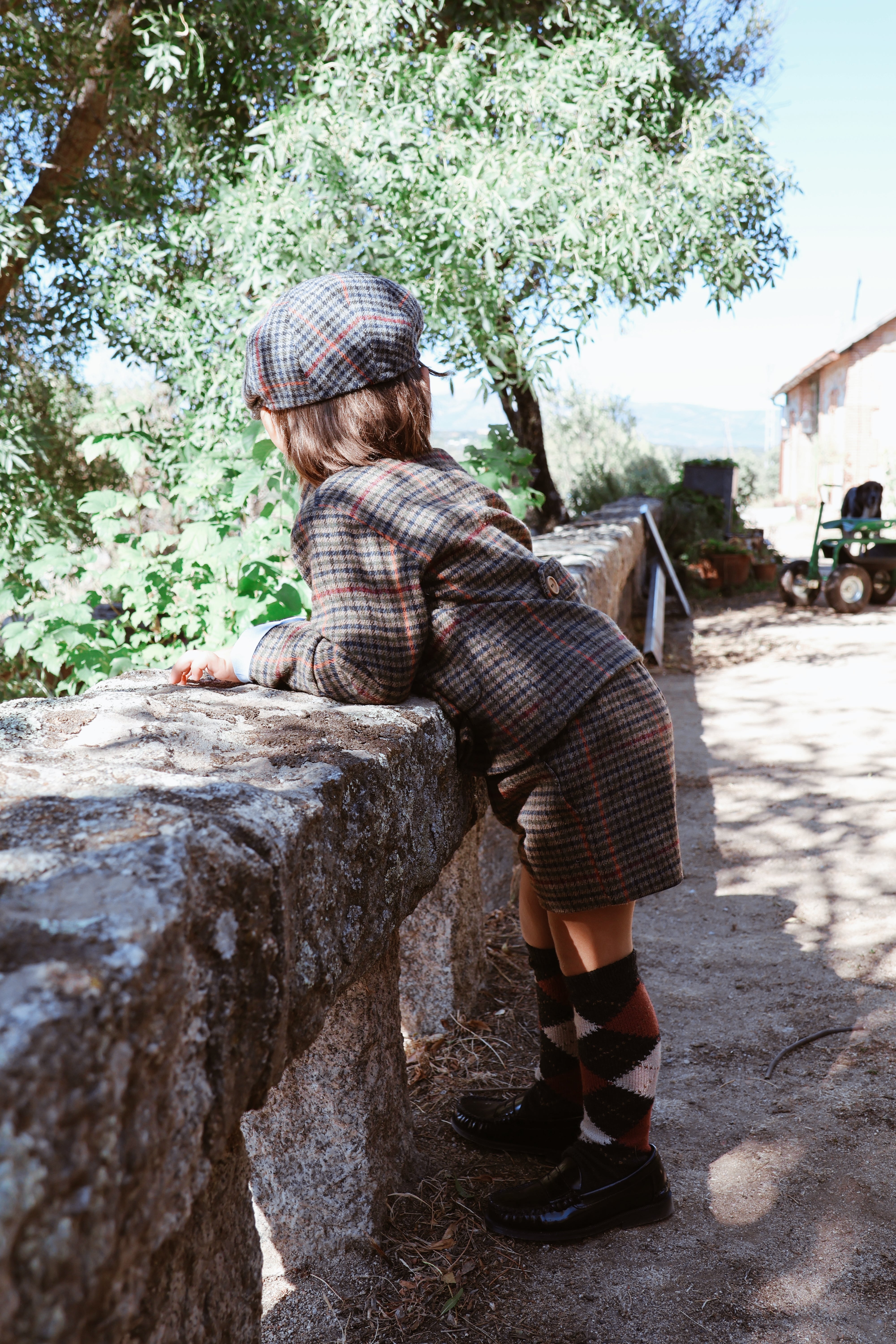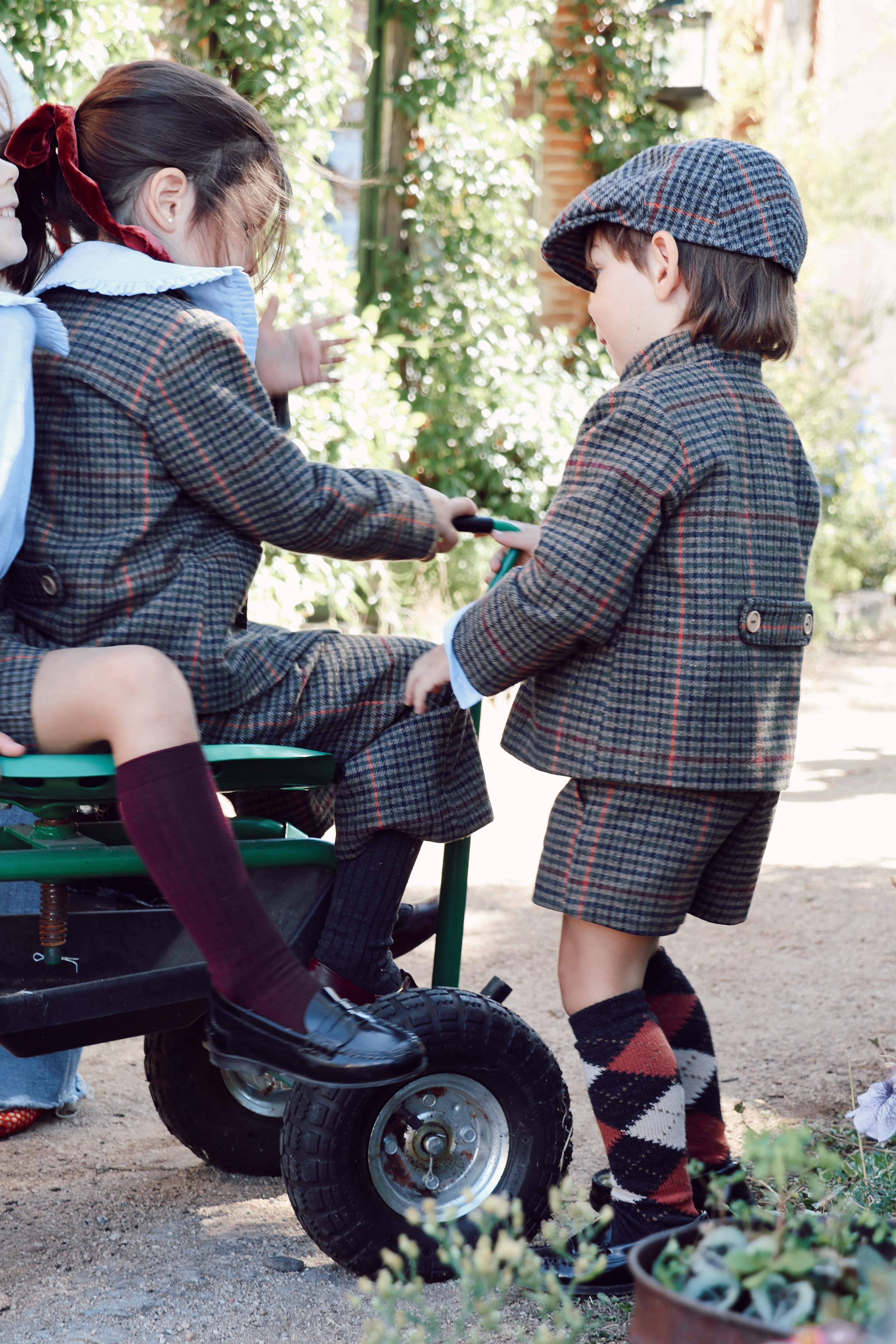 Pantalón corto de cuadros con raya burdeos, tejido lanoso calentito. Tiene bolsillos, botón delantero y cremallera, así como gomas ajustables en el interior de la cinturilla para adaptarlo perfectamente a su cuerpecito. Una prenda súper combinable y elegante para los más pequeños.