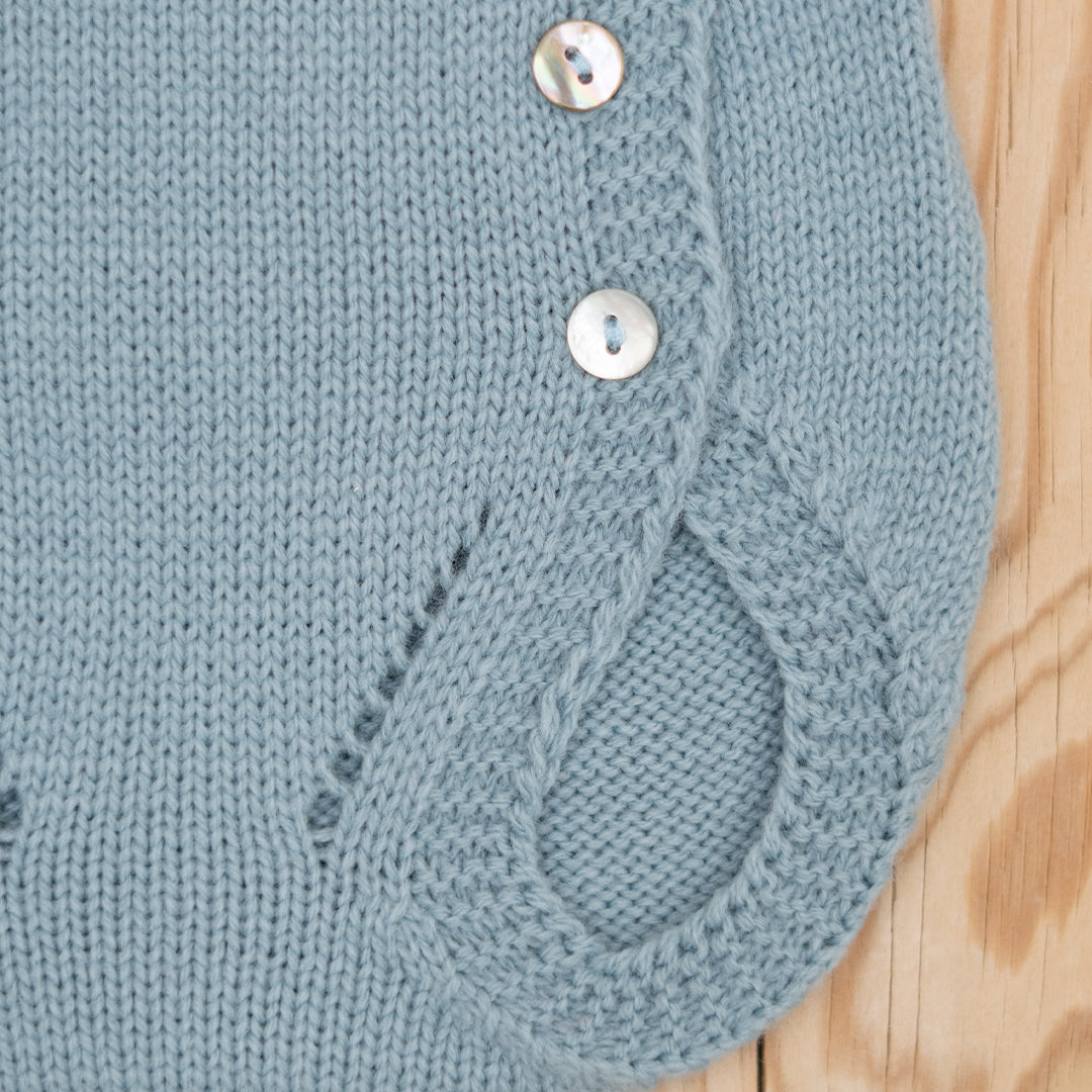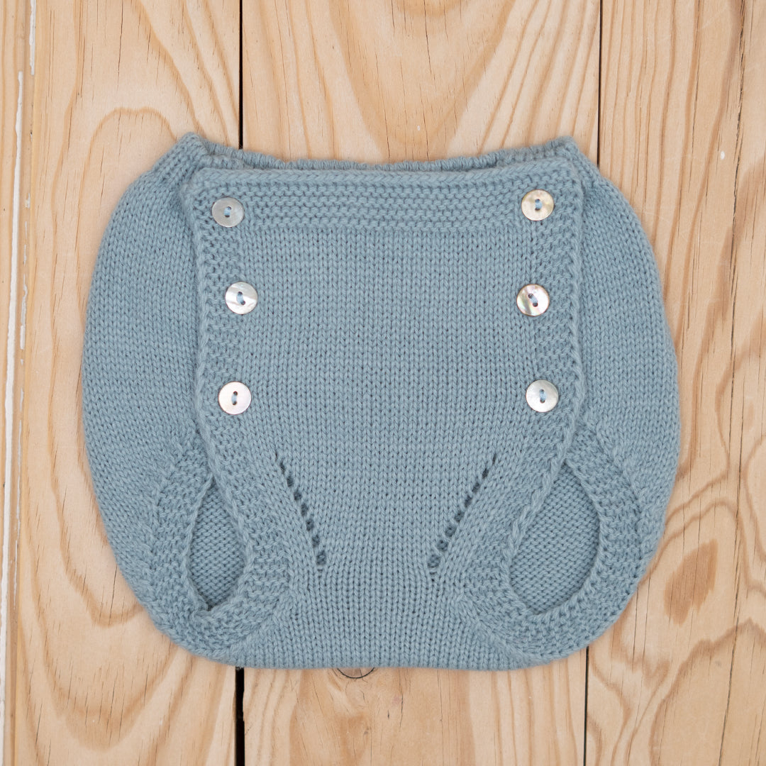 Cubre tira bordada azul con botones de nácar. Combinan ideales con los jerseys tira bordada de los mismos tonos.