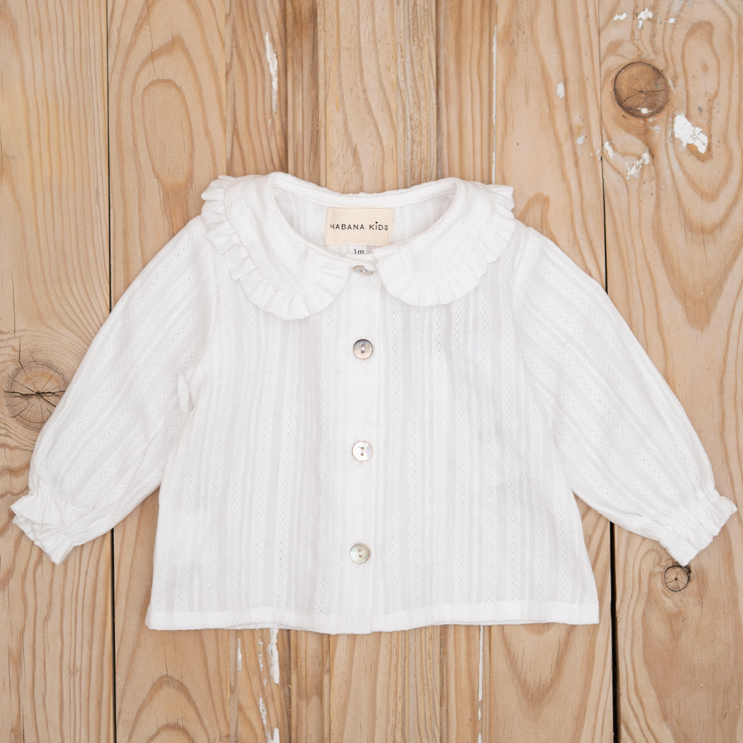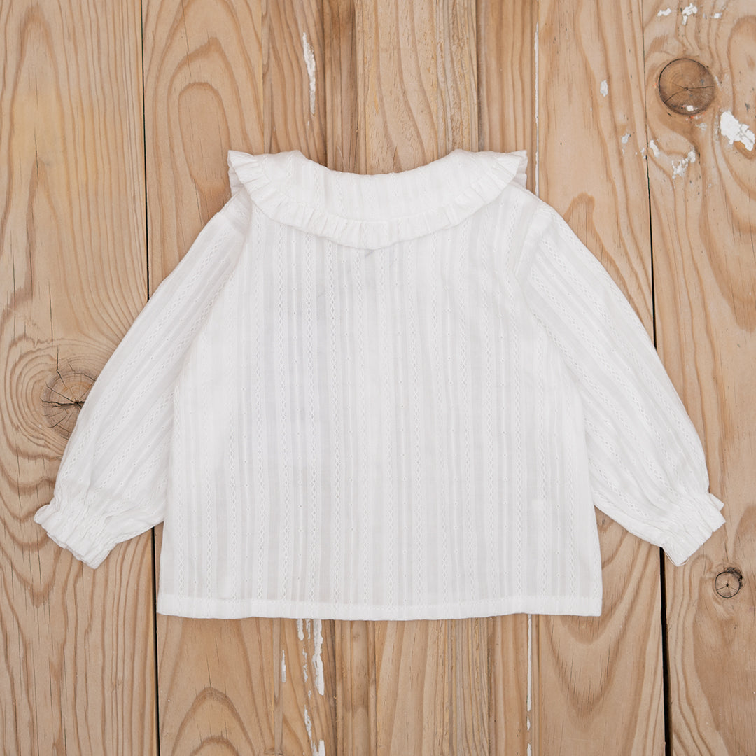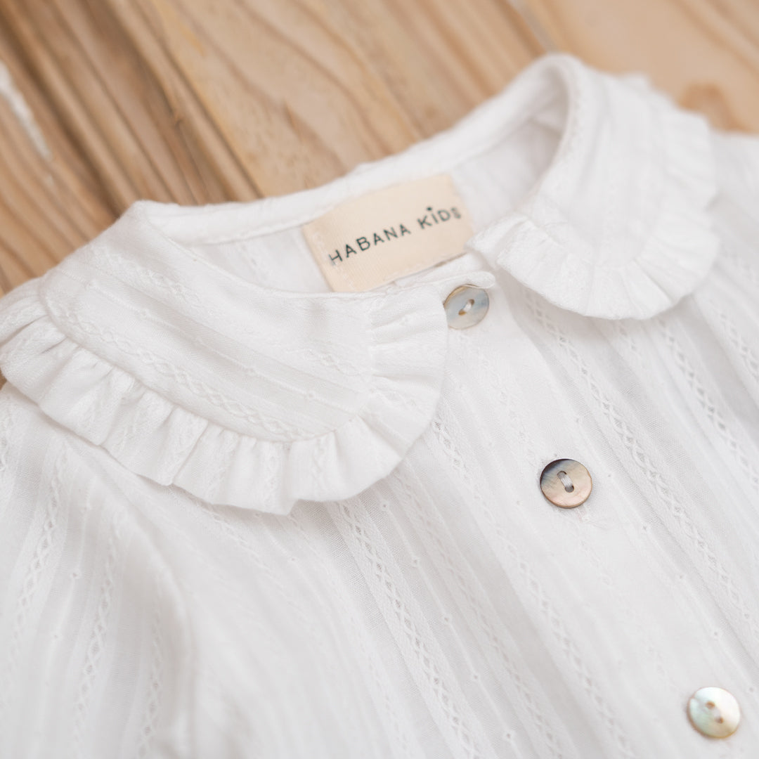 Blusa de manga larga y cuello bebé rematado con volantito en un precioso falso liso blanco. Abotonado en delantero y con suaves gomas en los puños.