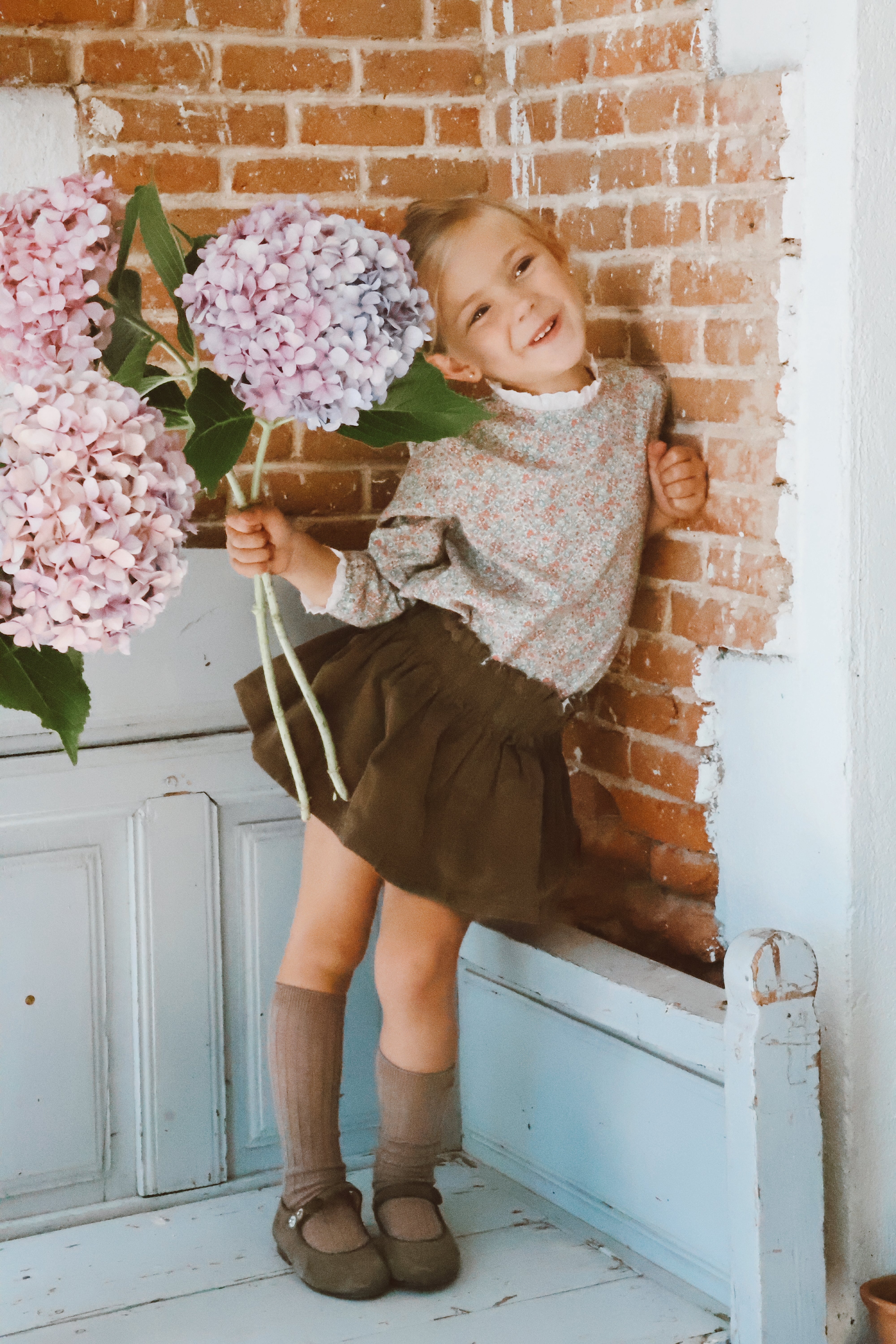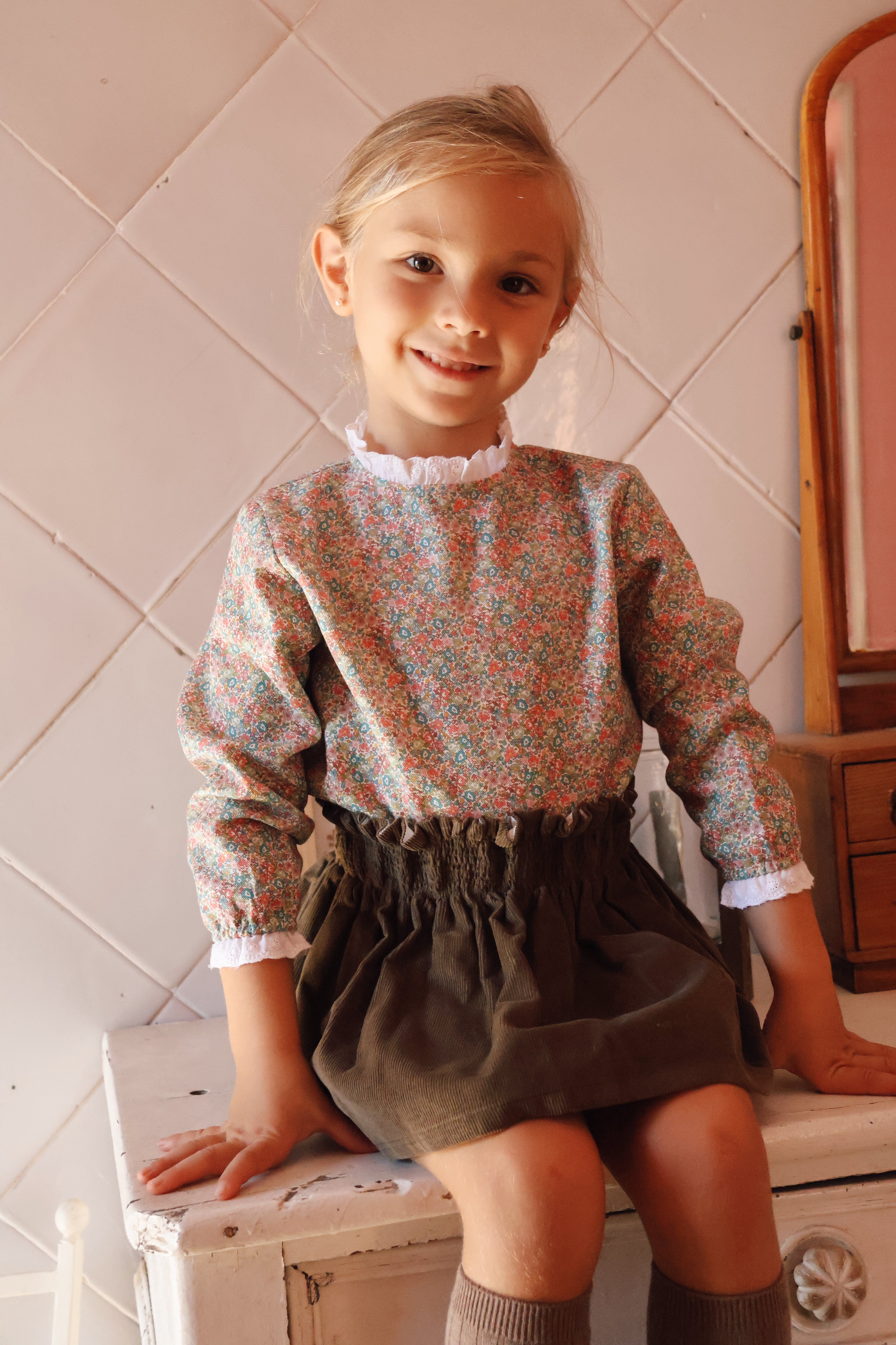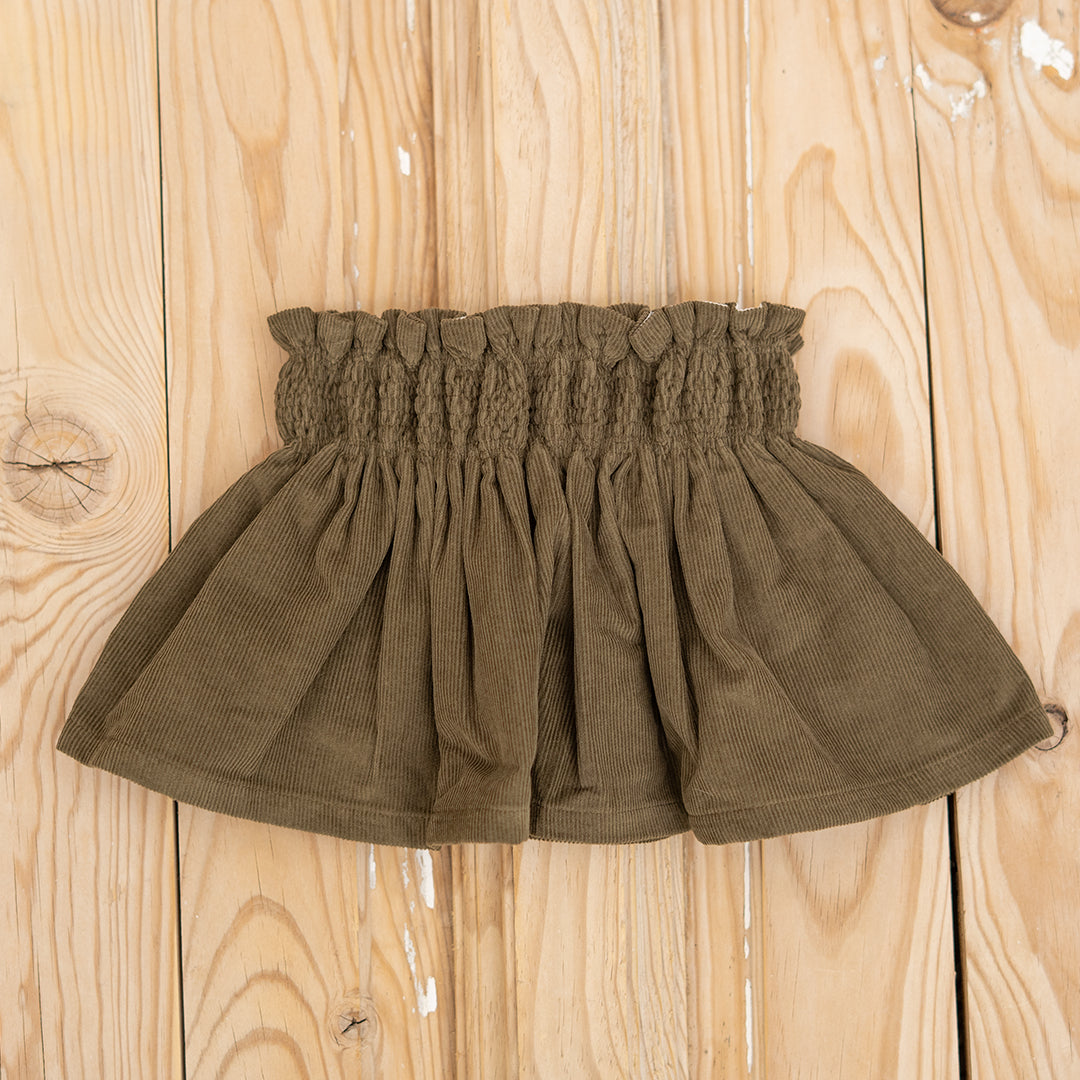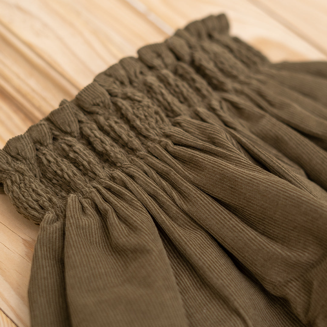 Monísima faldita corta de pana color kaki. Engomada a la cintura, lo que la hace, además de cómoda, muy estilosa y favorecedora. Sin duda, será una de sus prendas favoritas.