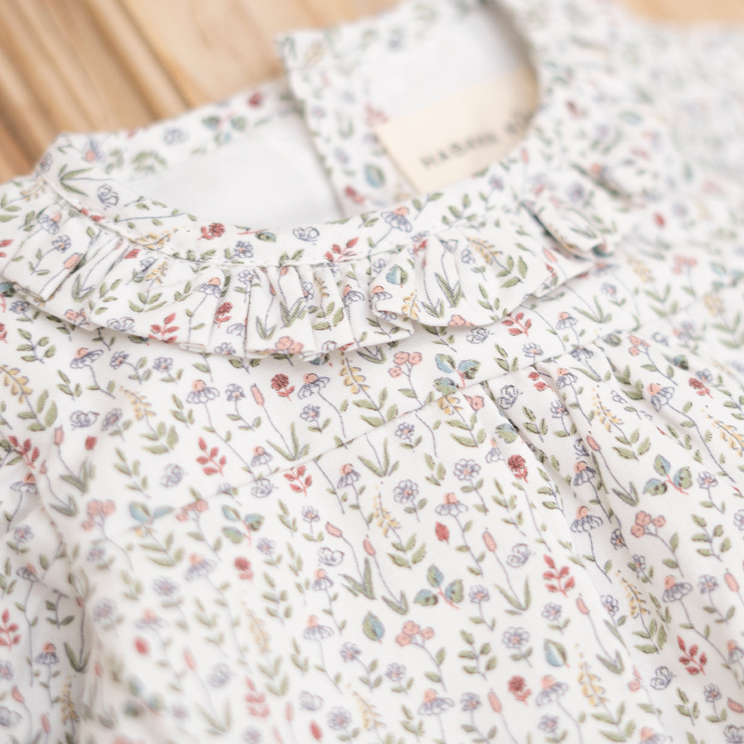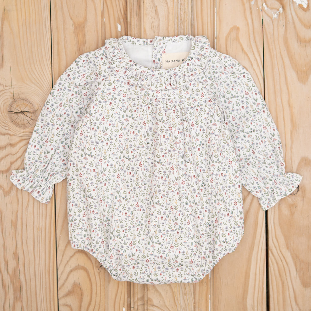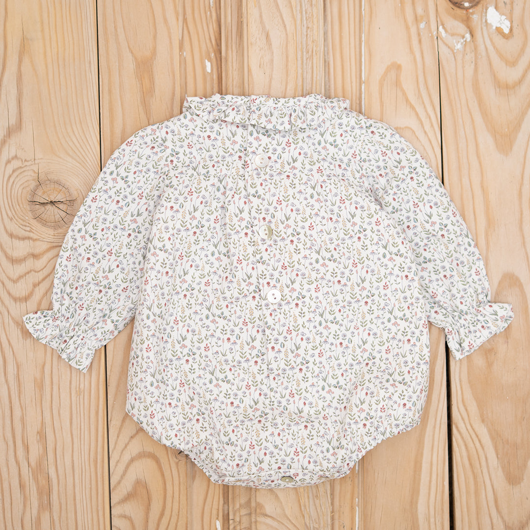 Precioso pelele de manga larga en nuestro estampado ideal de setas, compuesto de florecitas otoñales sobre fondo crudo. Cuello de volantito súper favorecedor. Abotonado en espalda y en bajo para facilitar la puesta y cambio de pañal.