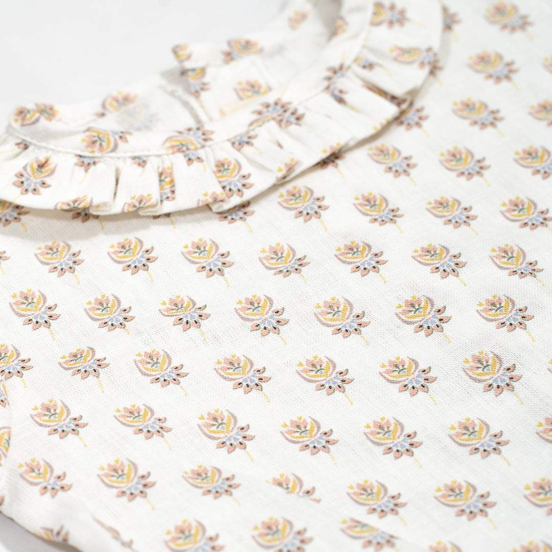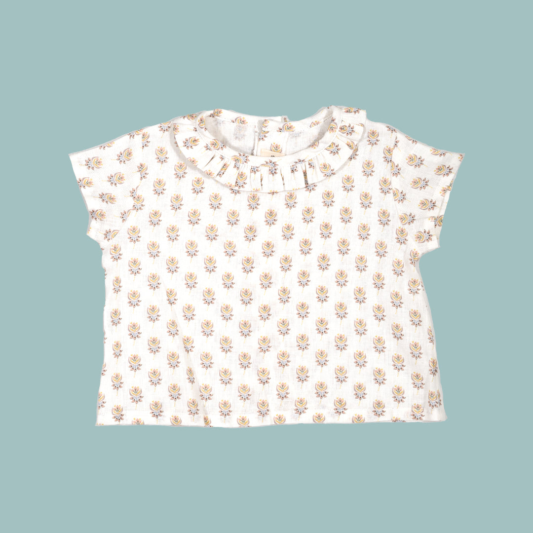 Blusa de manga corta con volantito en el cuello en nuestro estampado de flor INDIE. Un estampado étnico de lo más dulce. Se abotona en espalda de arriba abajo.
