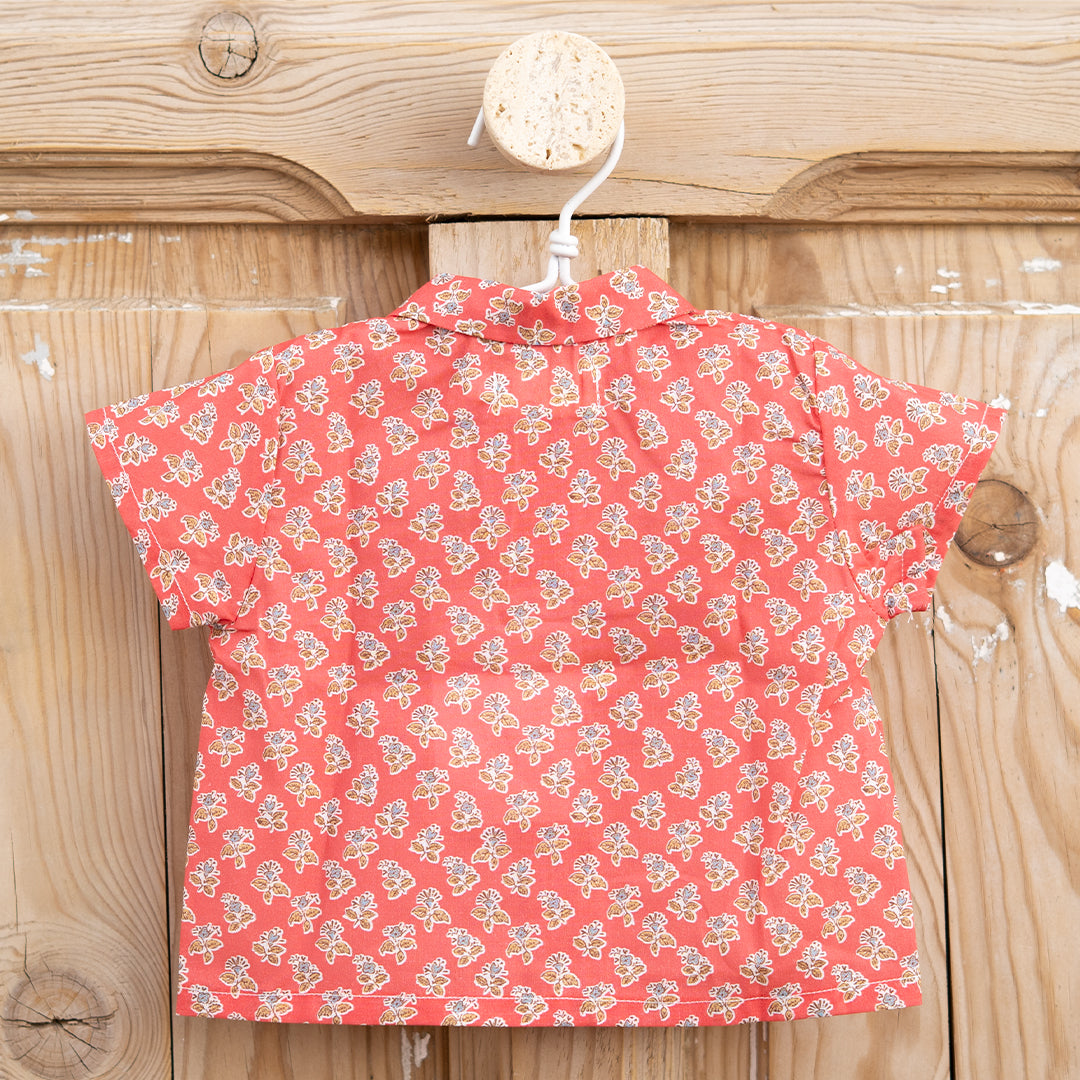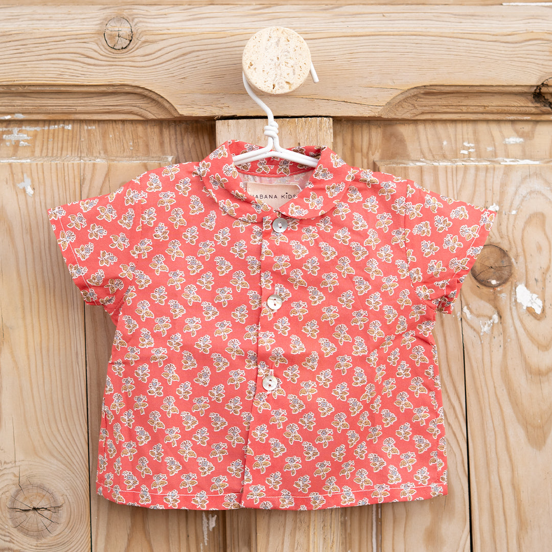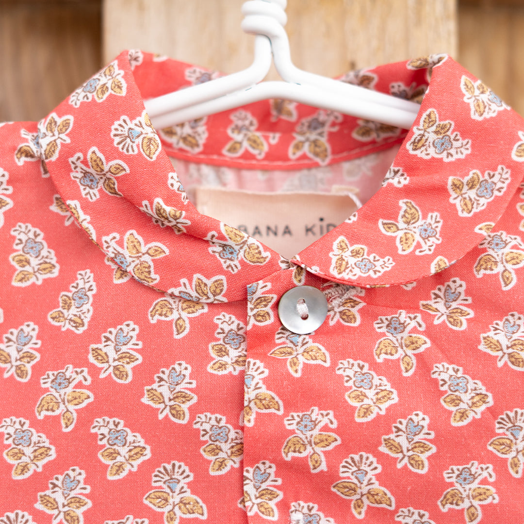 Blusa de manga corta y cuello bebé con nuestro estampado de flor mandarina. Abotonado en el delantero. Una prenda fresquita y muy estilosa.