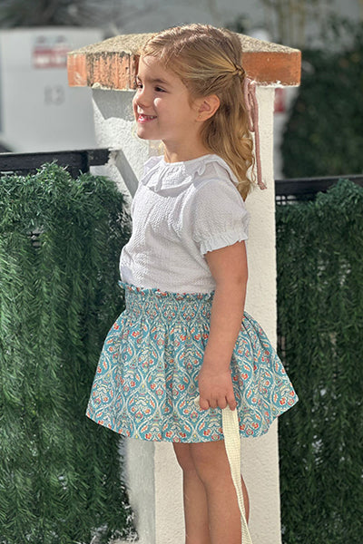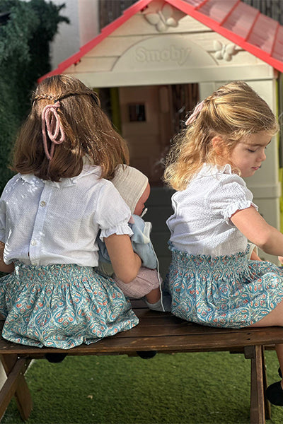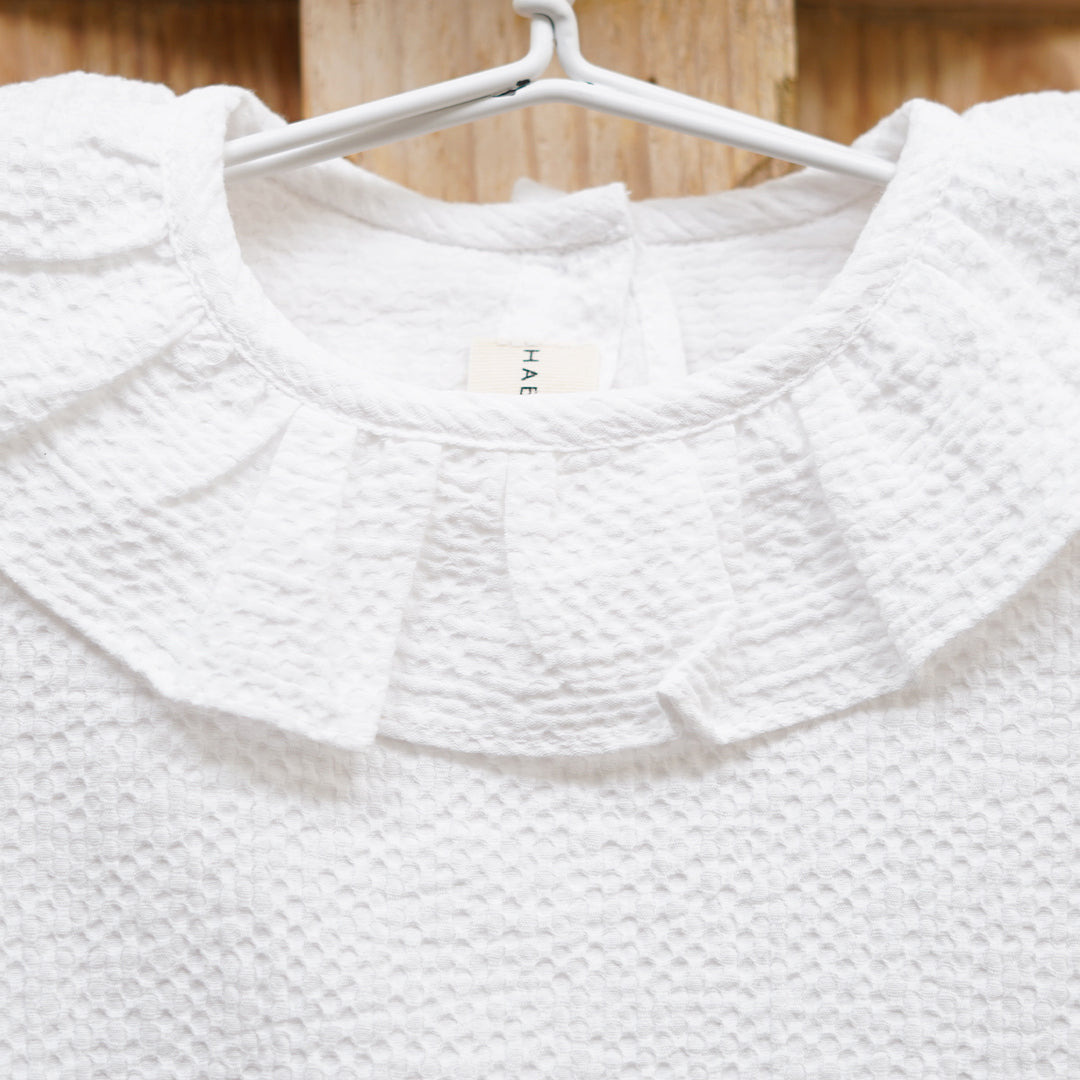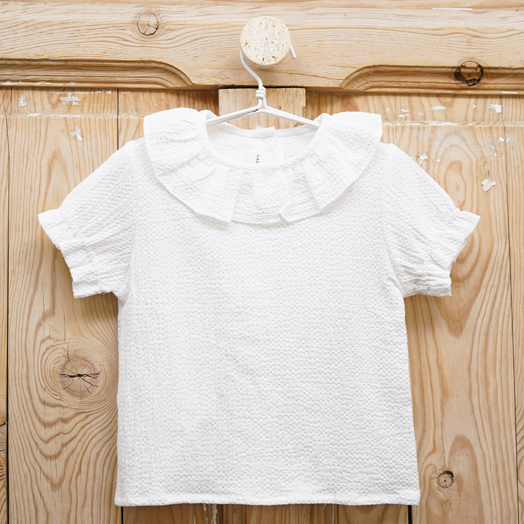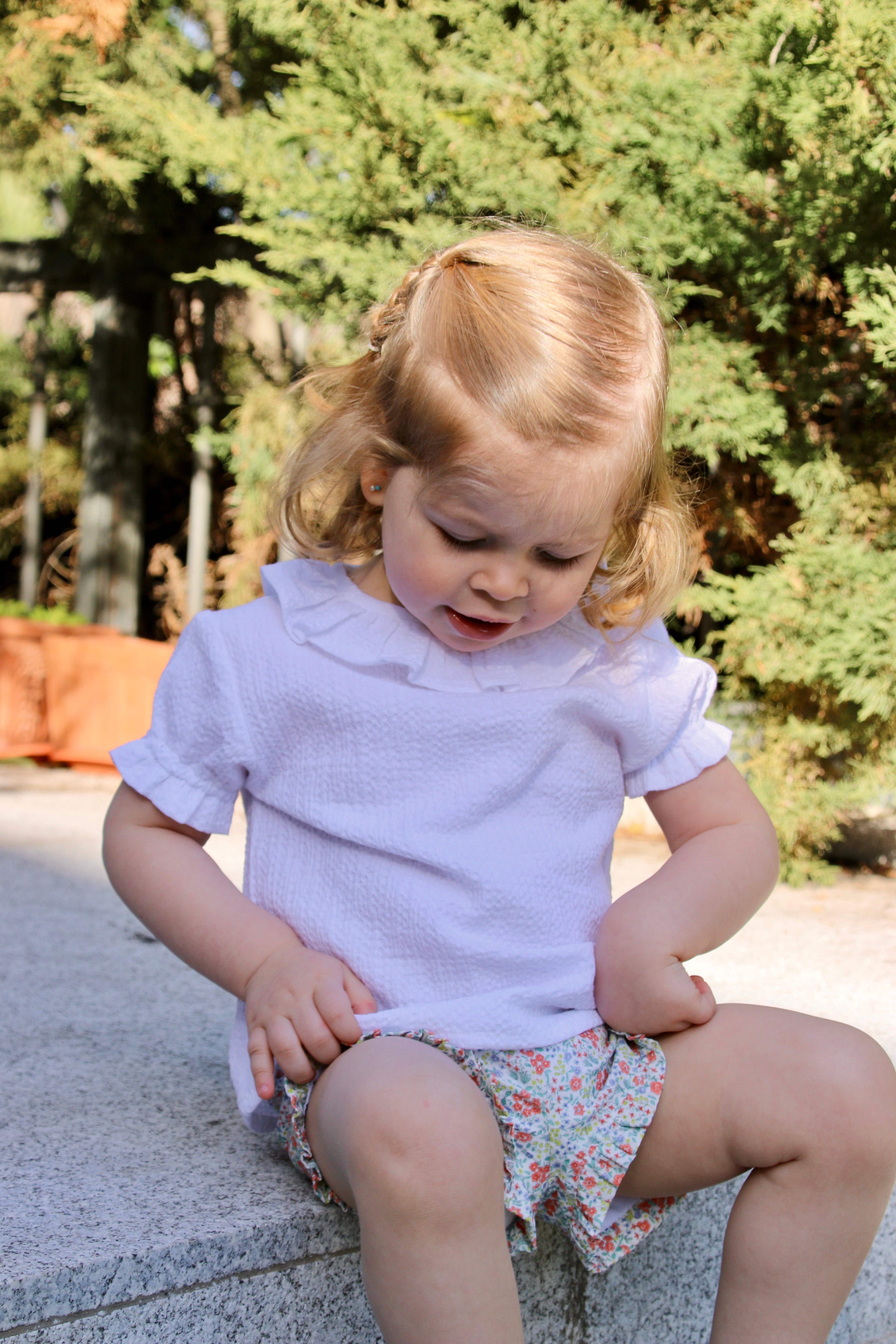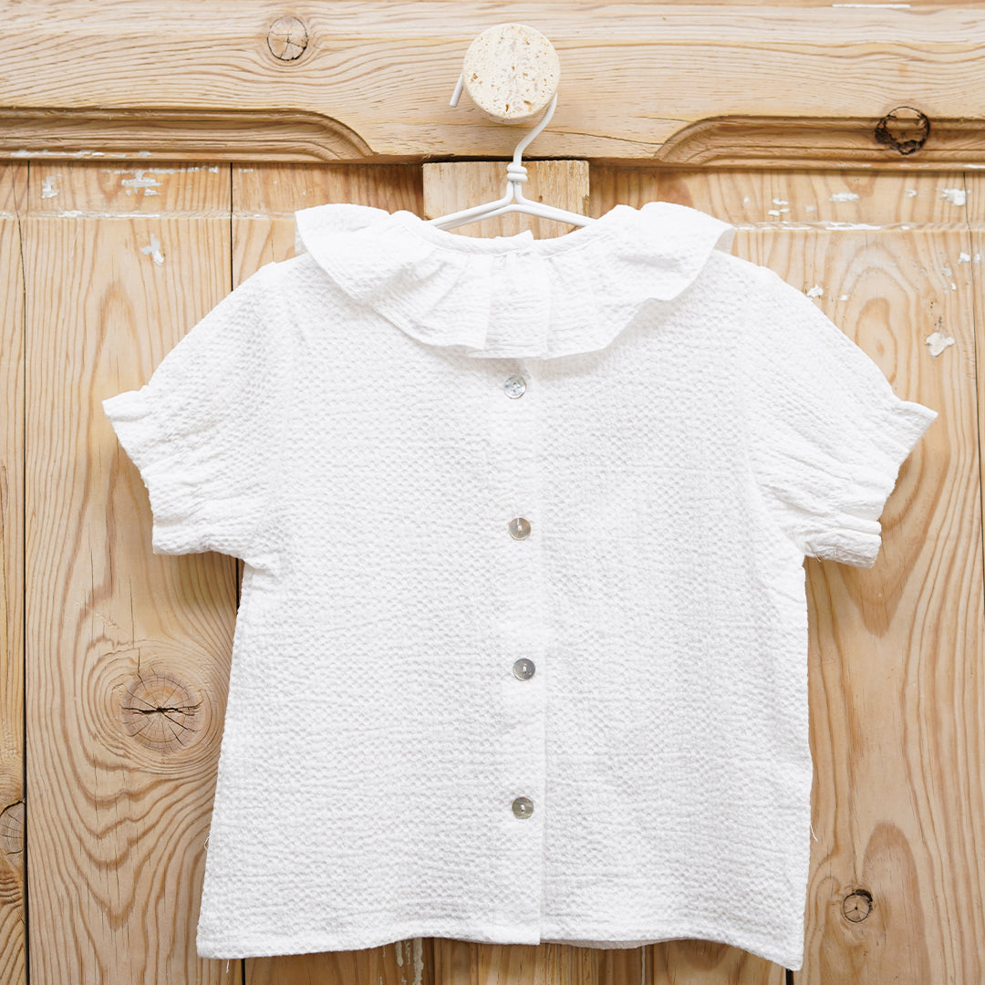 Blusa de manga corta con volantito en el cuello y en las mangas abullonadas. El tejido es muy fresquito para el verano y una prenda muy versátil. Un fondo de armario perfecto. Se abotona en espalda de arriba abajo.