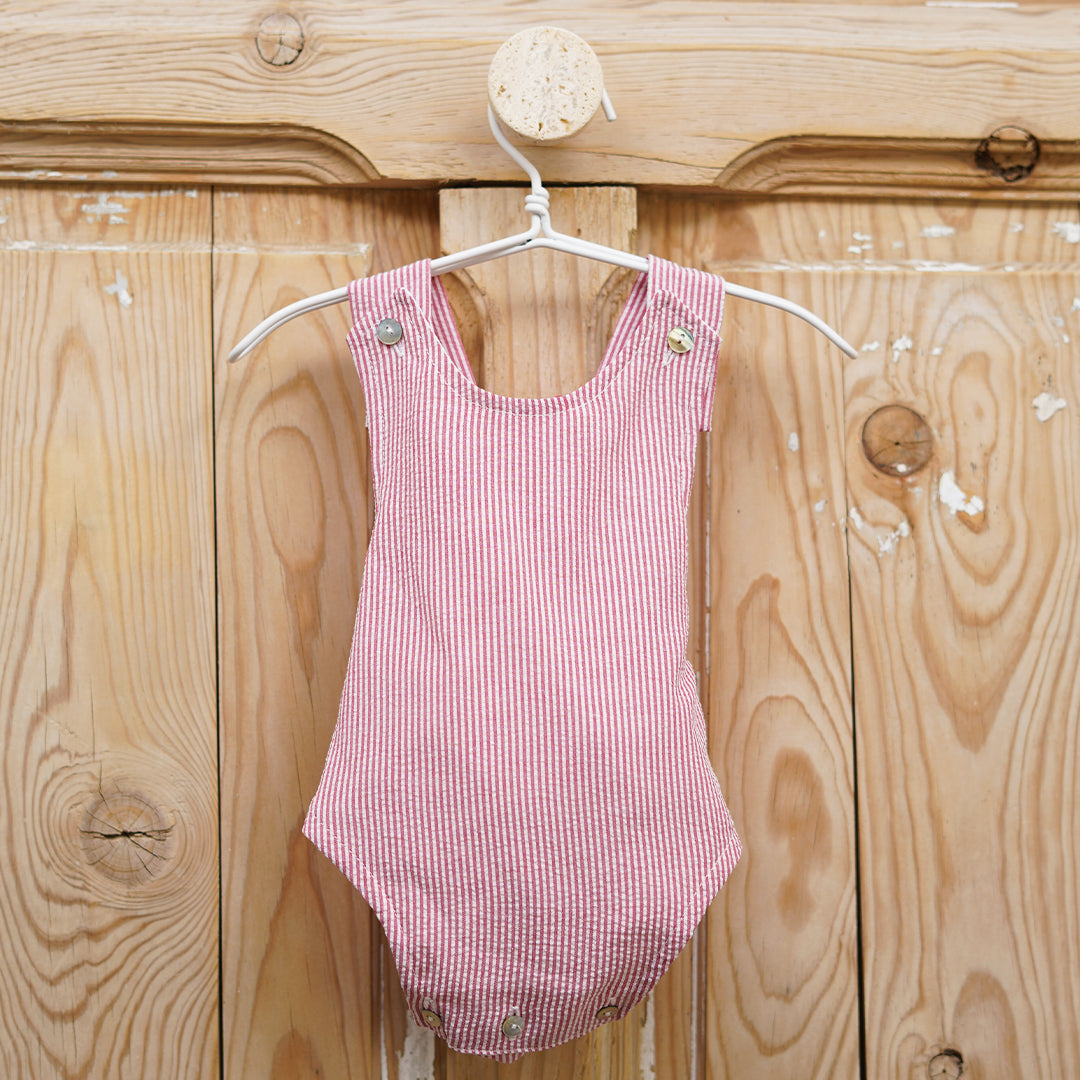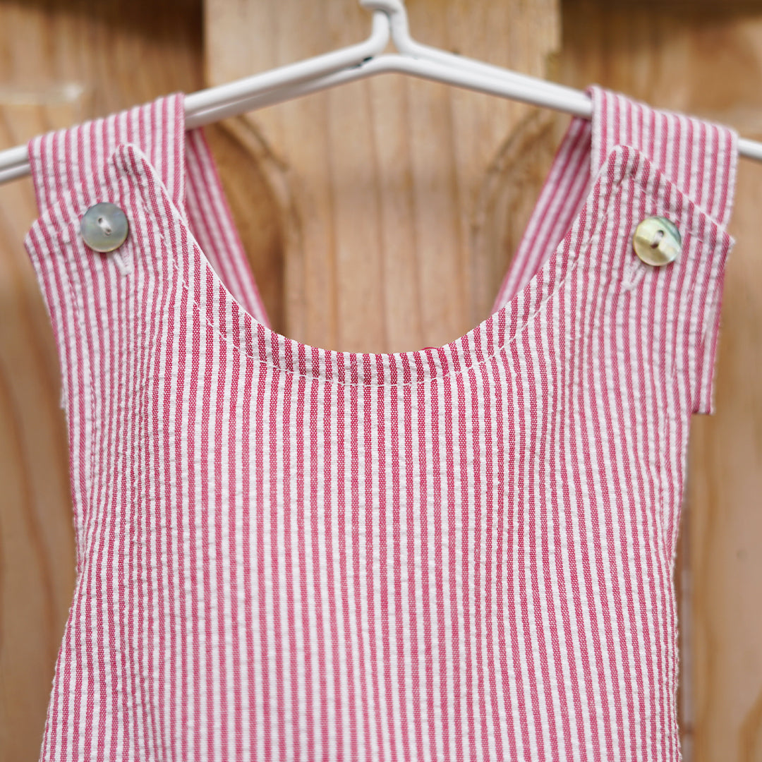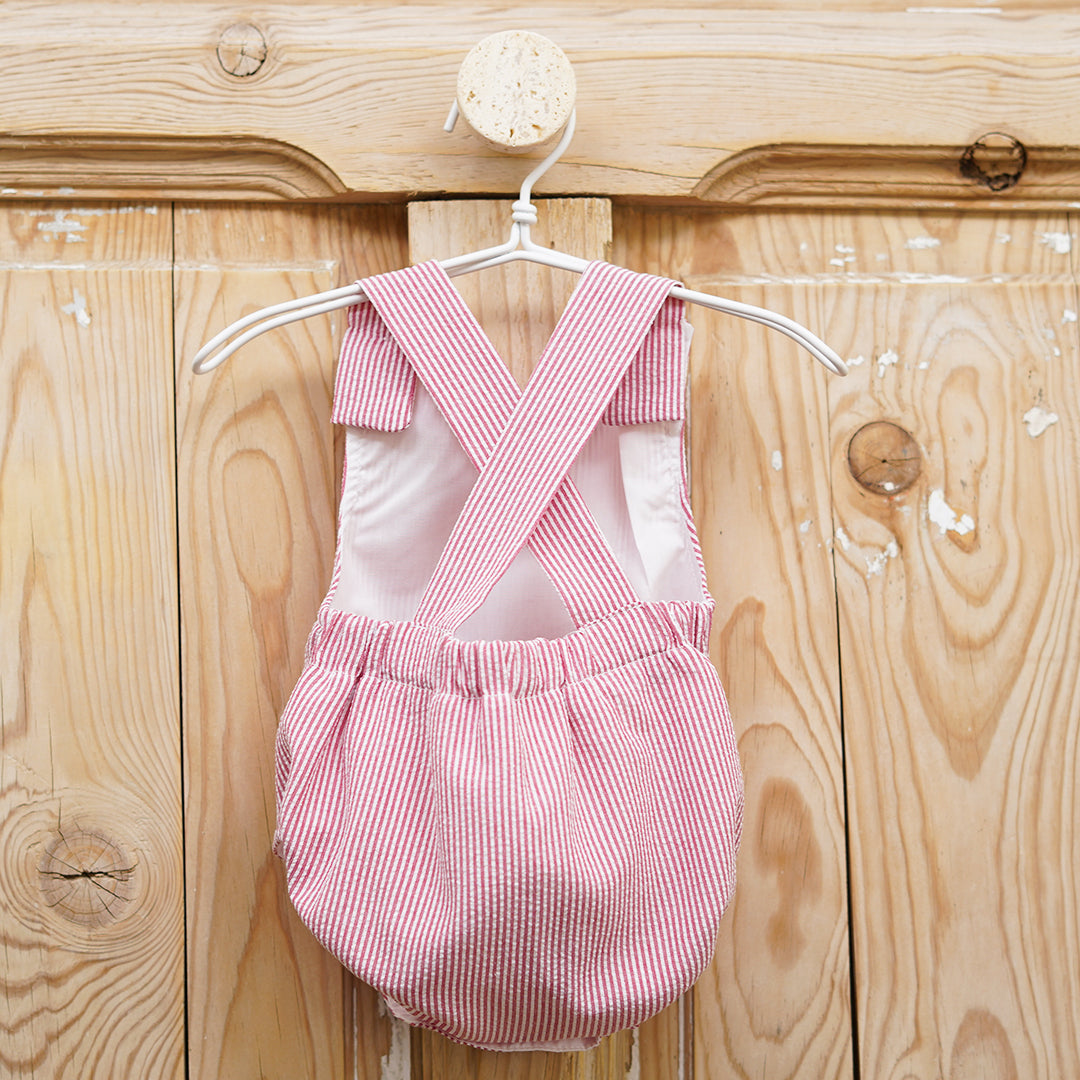 Ranita de bebés en tejido de rayitas finas en rojo y blanco, de tirantes cruzados en espalda y gomita en cintura y muslos, esta es muy blandita para no apretar el cuerpo del bebé. Botón en el tirante, lo que alarga la vida de la prenda. Nos encanta tanto con blusita debajo, como sin nada. Prenda forrada.