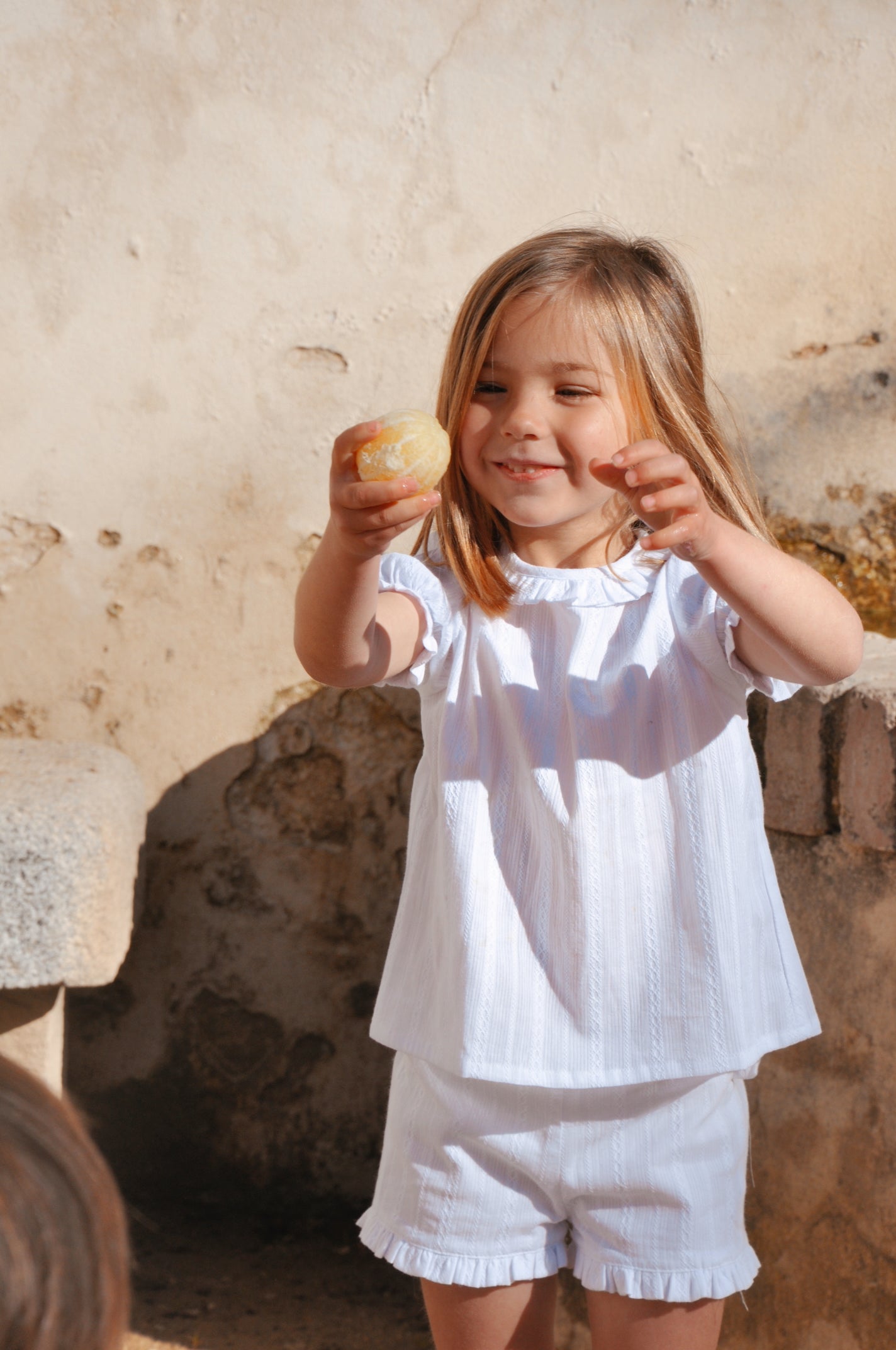 Short en tejido falso liso blanco, efecto vainicas muy especial. Tiene cinturilla y botones en los laterales, que elevan la prenda. En espalda tiene cinturilla engomada, con goma ajustable en el interior. Lo más especial de la prenda es el bajo terminado en volantito, súper favorecedor.