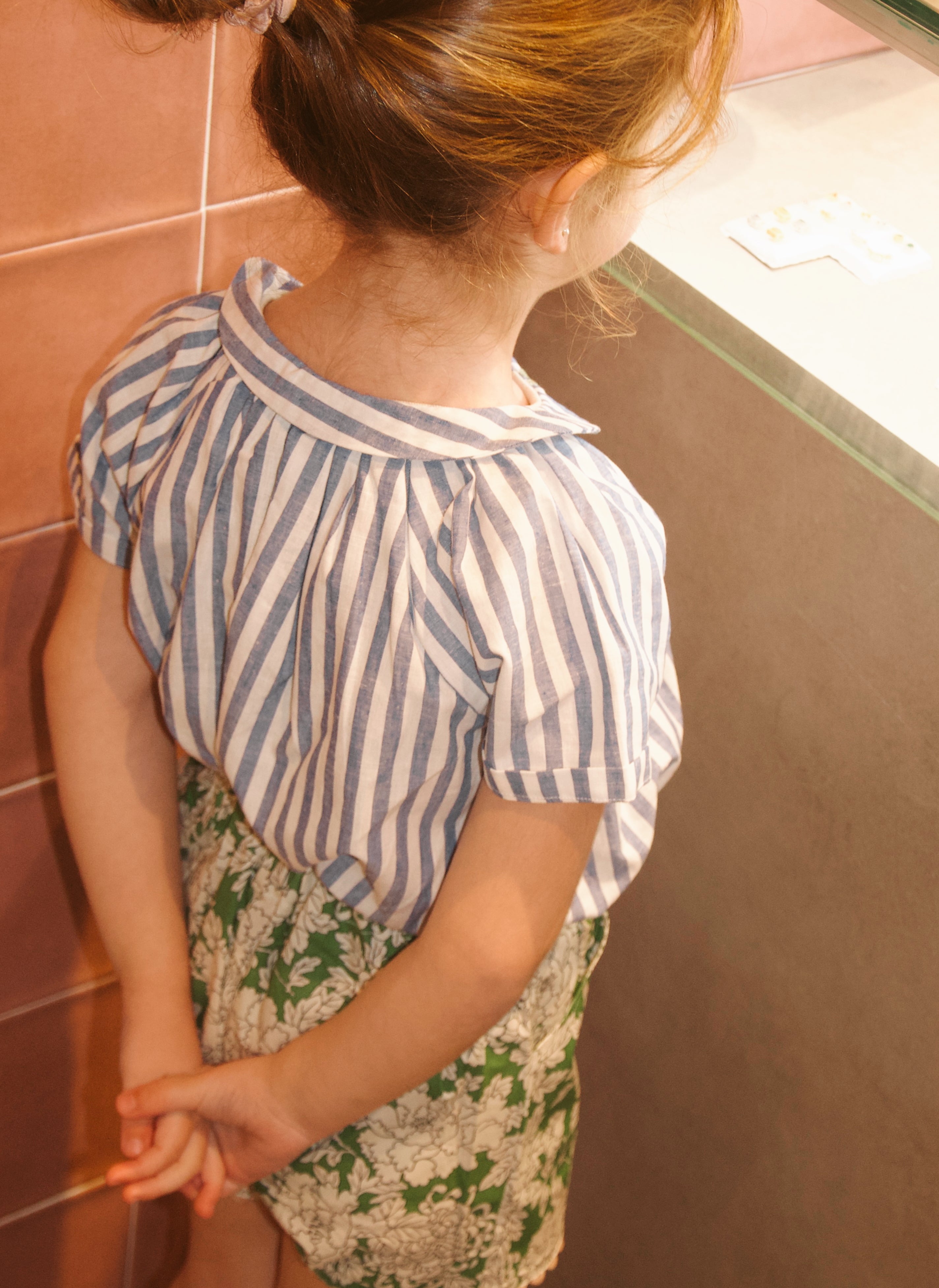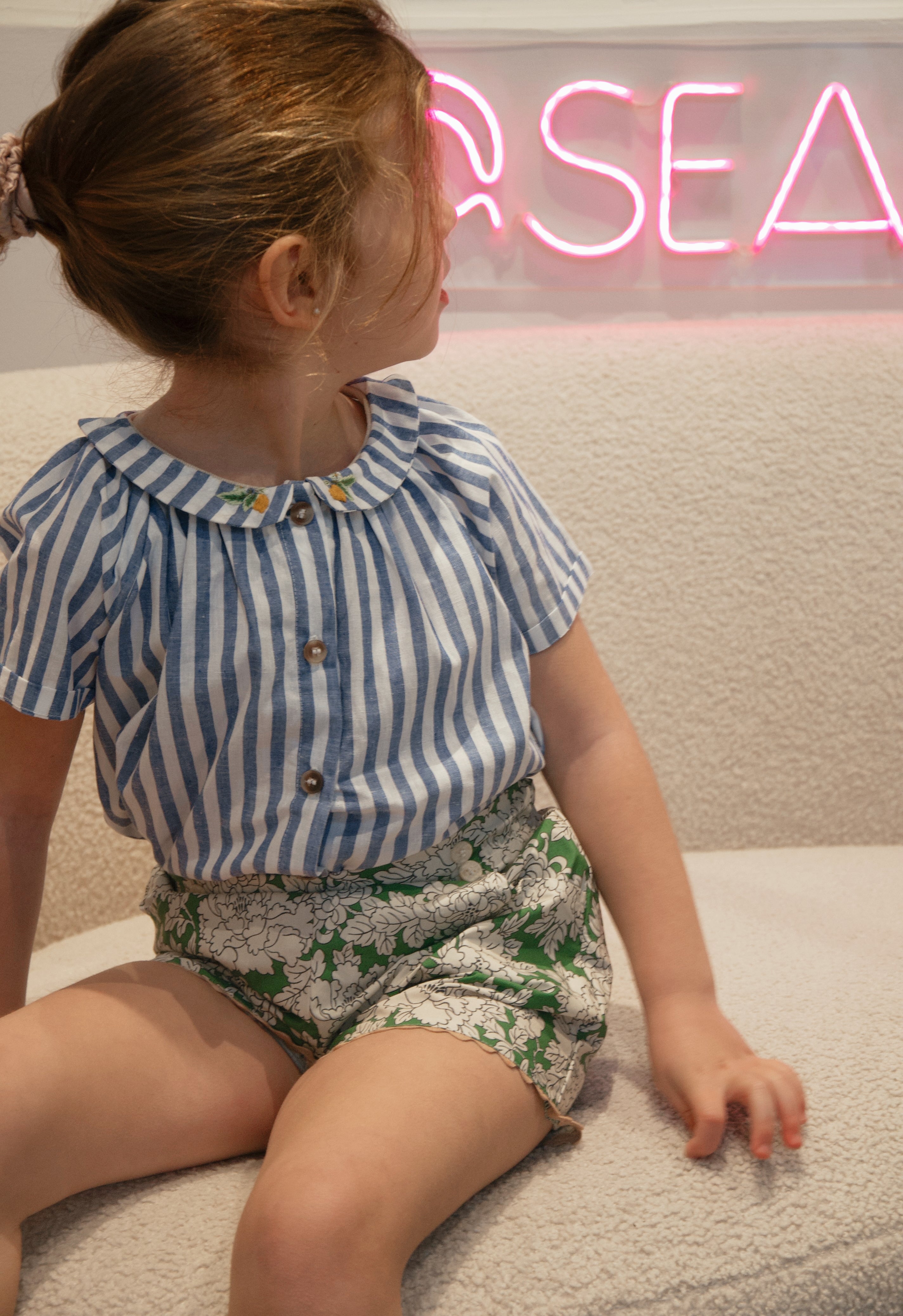 Pantalón corto estampado en un Liberty London® original, súper fresco y divertido, en verde, gris y crudo. Botones decorativos en el delantero, bolsillos funcionales y bajo rematado con cinta de ondulina a contraste en rosa palo.