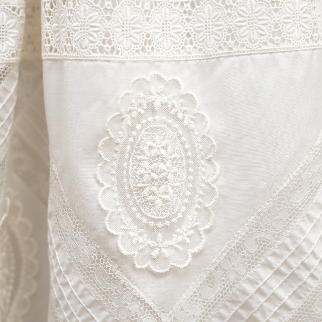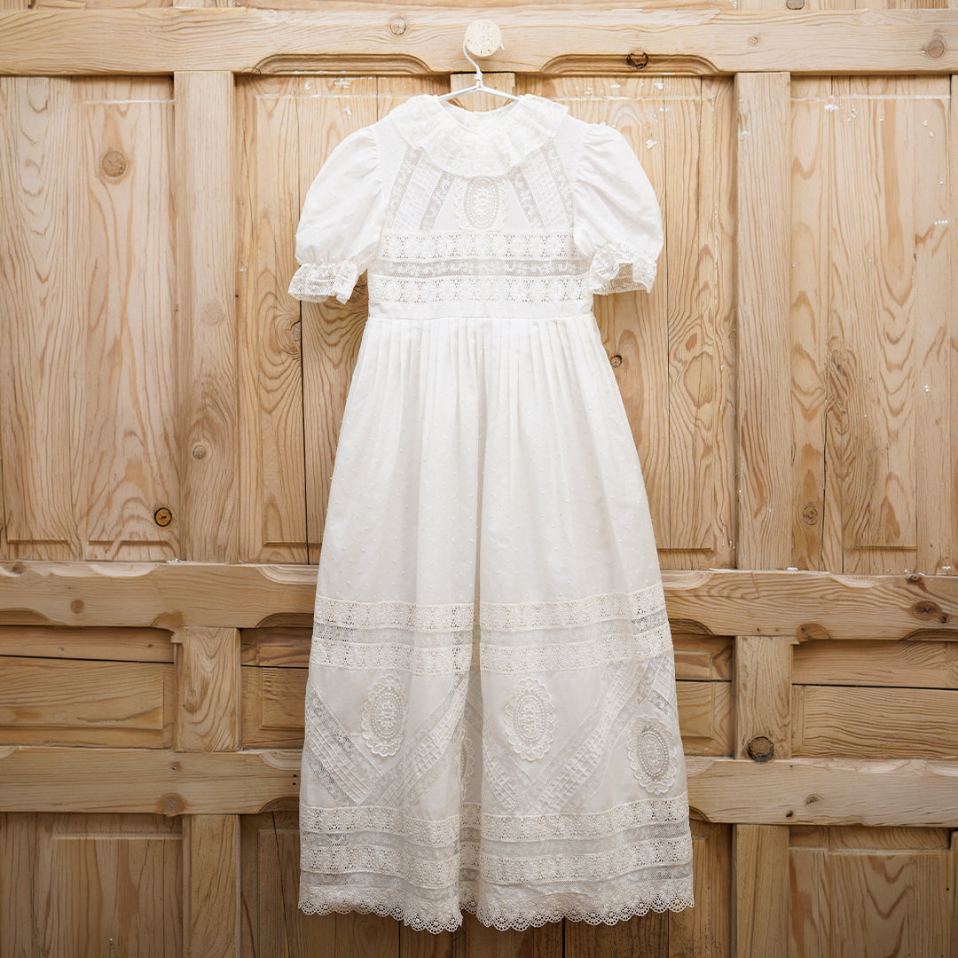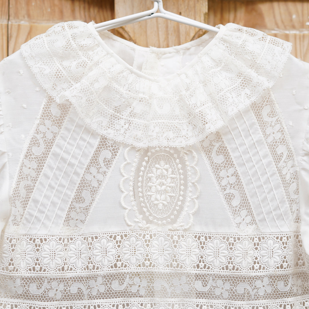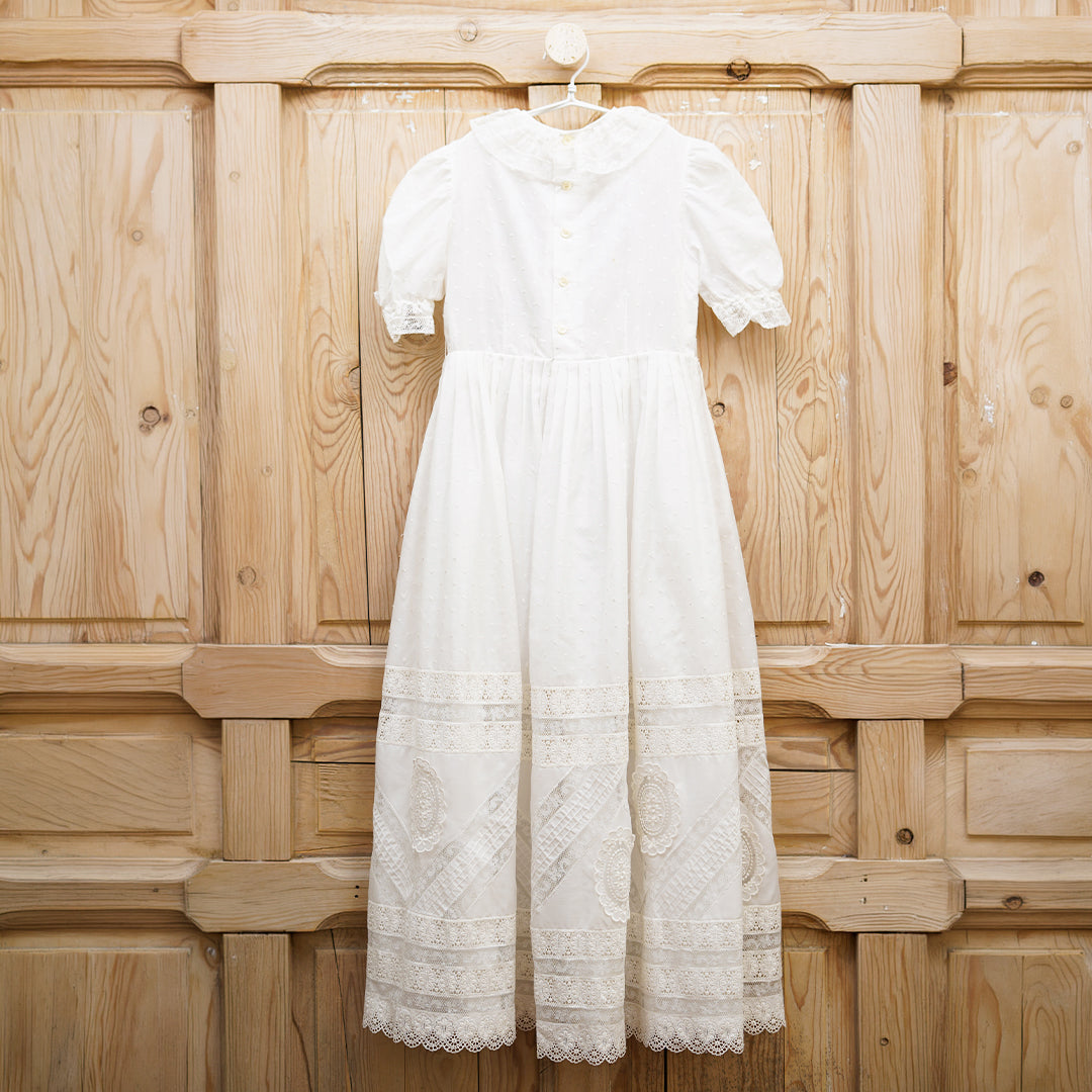 Exclusivo vestido de comunión en tela de plumeti con encajes de diferentes dibujos incluyendo medallones de guipur en pecho y falda. Las mangas son de tipo farol rematada con encaje antiguo y el cuello redondo rematado en el mismo encaje antiguo. Lleva forro en la parte de la falda para aportar volumen. Se cierra con botones en la espalada.