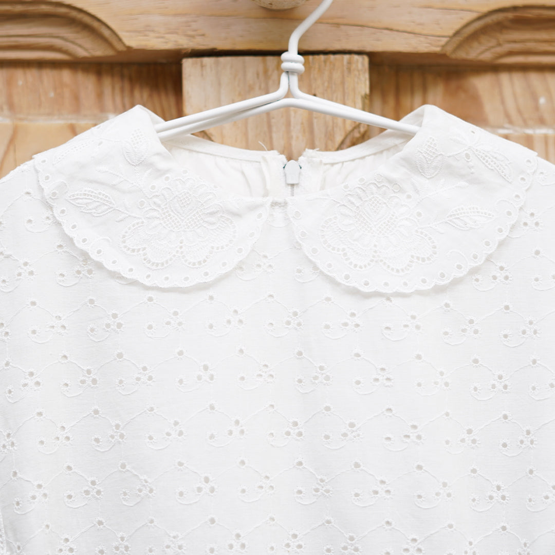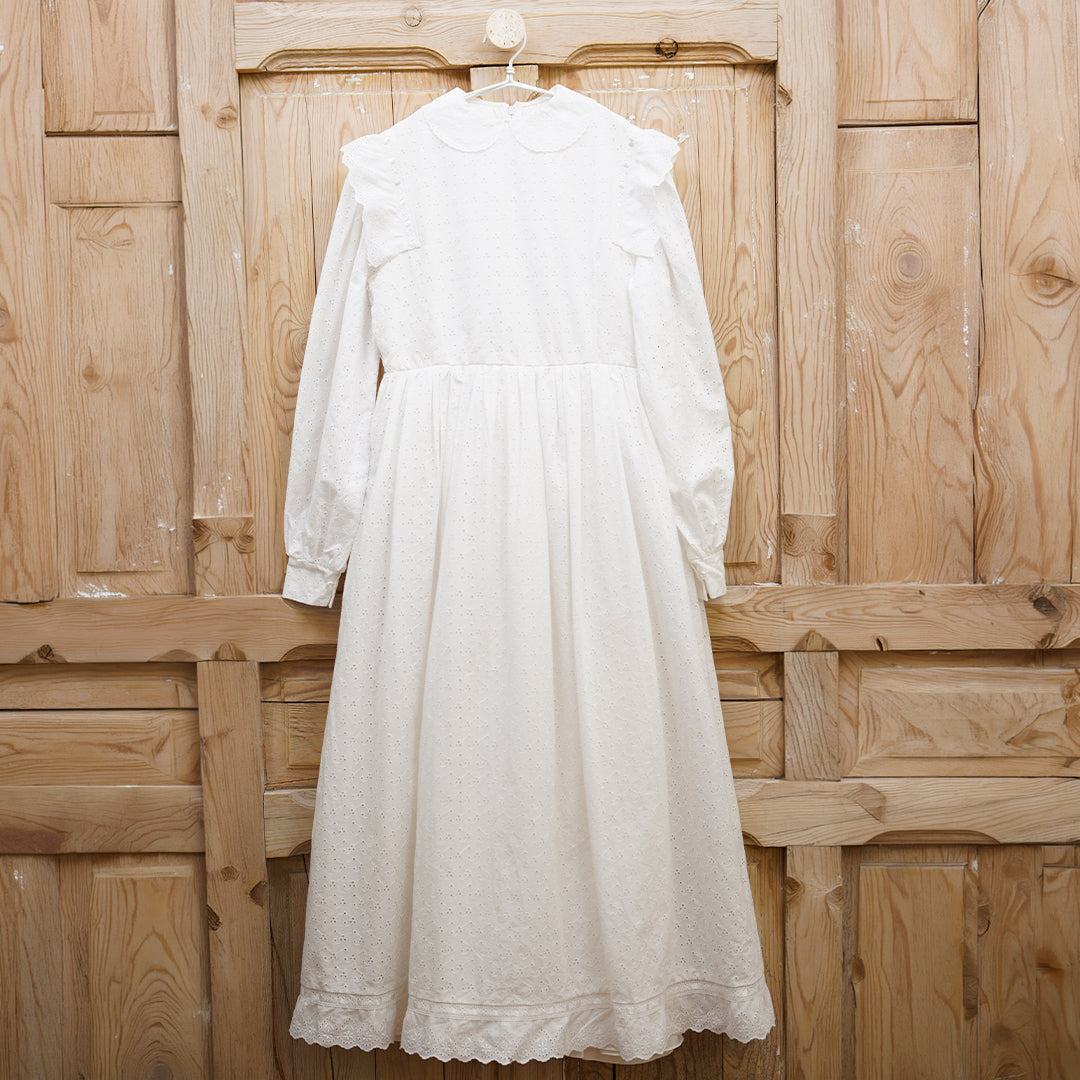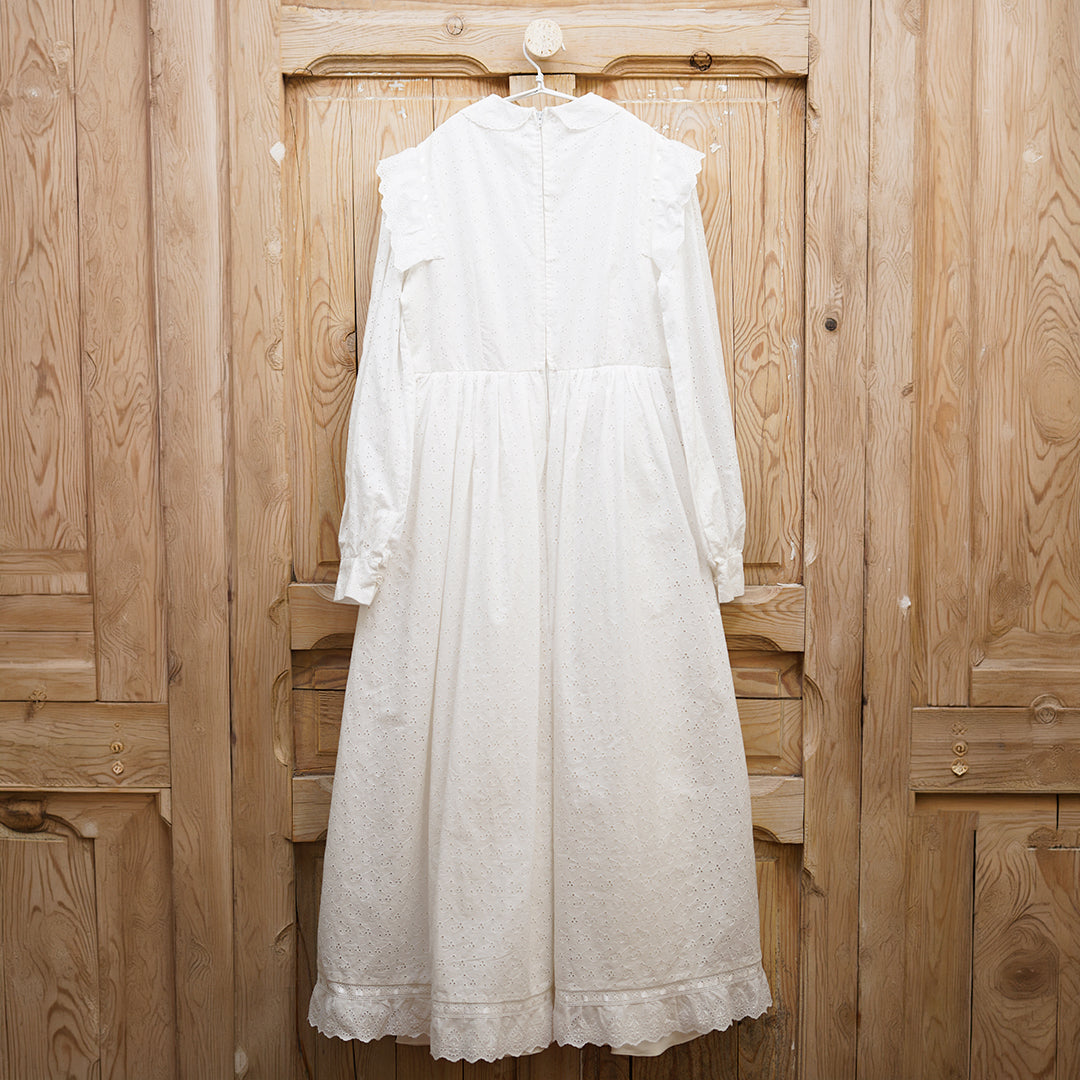 Exclusivo vestido de comunión de manga larga y cuello bebé. Tono blanco. Confeccionado en tela de algodón perforada. Detalle de puños camiseros. Pasacintas con lazo blanco en hombros y parte de abajo del vestido. Lleva forro de tul en la parte de la falda para aportar volumen. Se cierra con cremallera en la espalada.