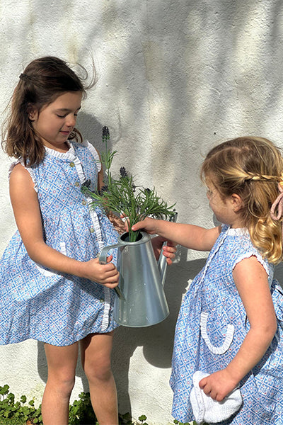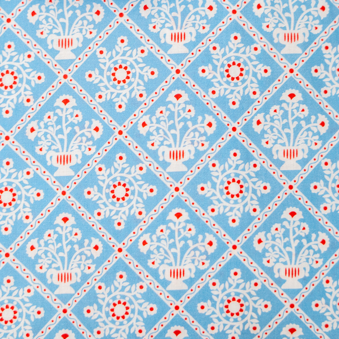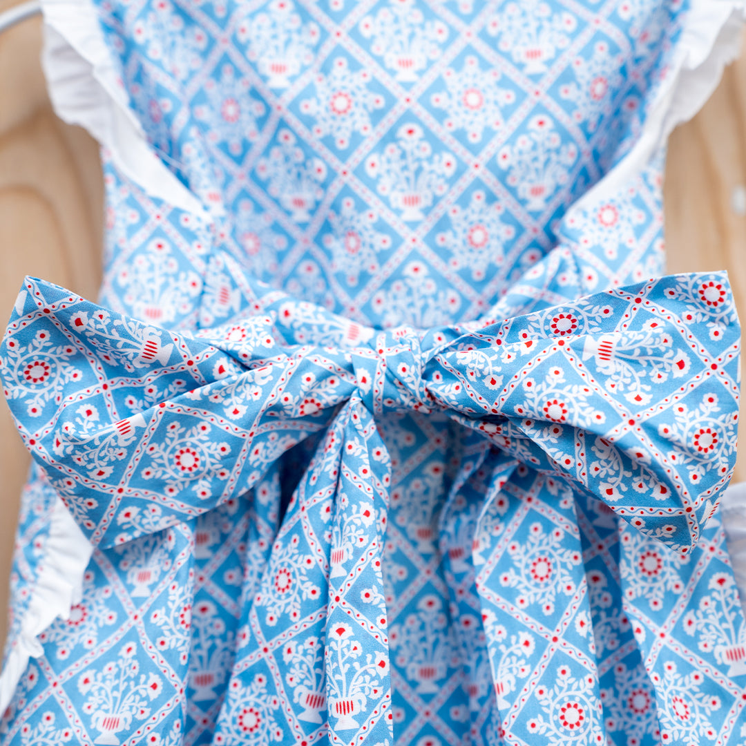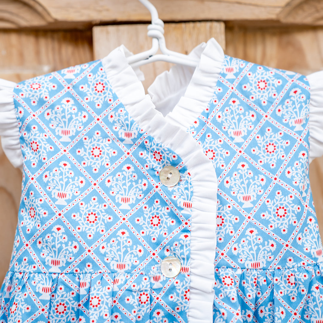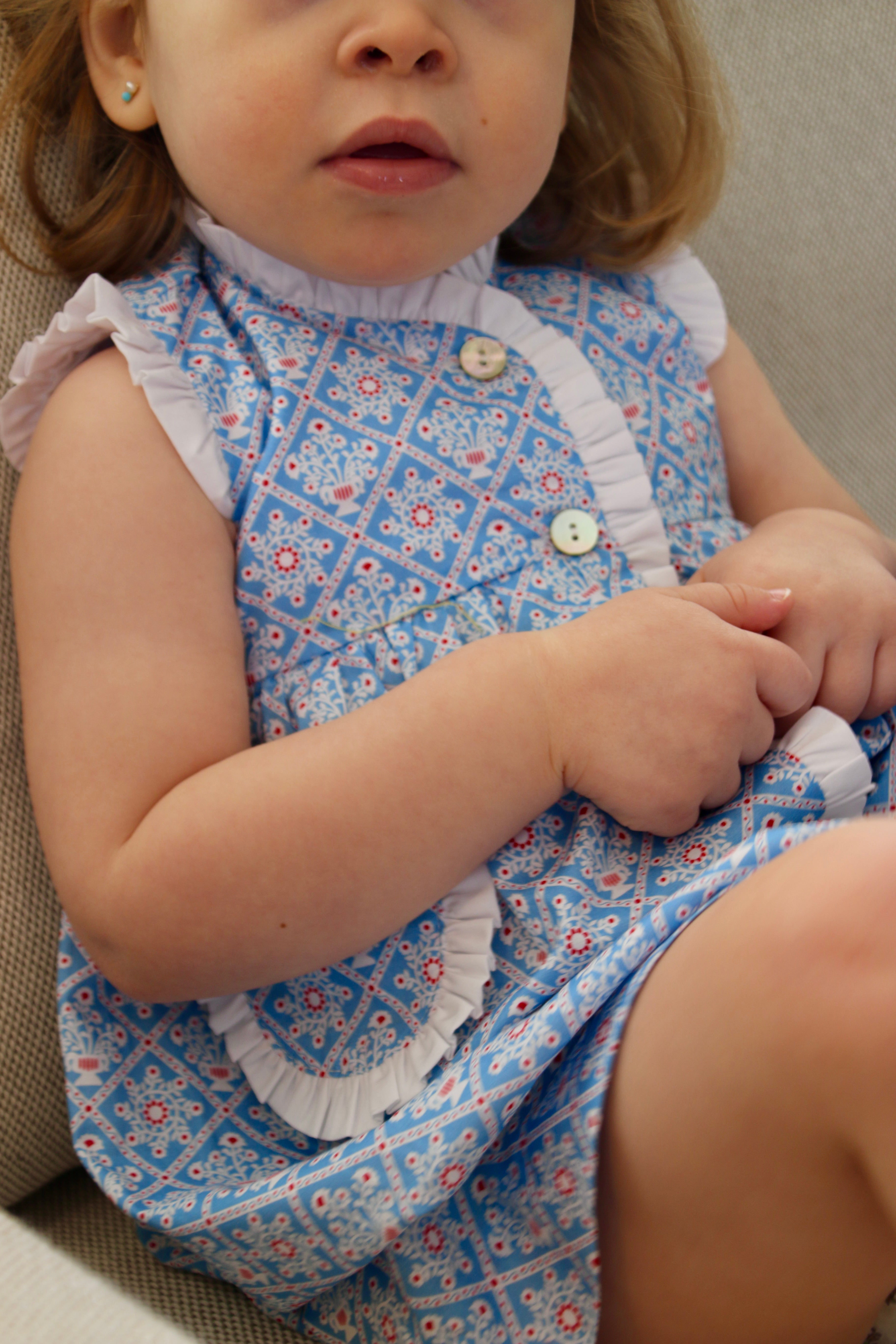 Vestido sin mangas en estampado de mosaico en fondo azul y dibujos, uno de nuestros estampados más especiales. Se abotona en delantero y va todo rematado con volantito contraste en blanco, cuello, abertura, sisas y bolsillos. Tiene una bonita lazada al tono en la espalda. Ideal para diario o eventos más especiales, dependiendo de los zapatos que se le pongan.